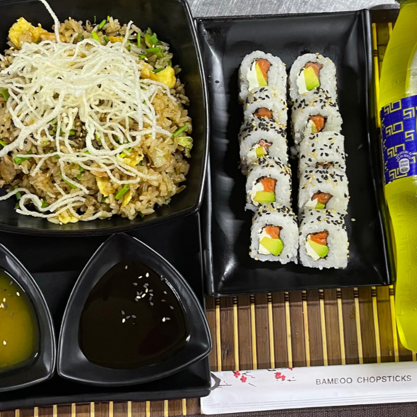 Arroz chaufa, 10 bocados de sushi acevichado y disfruta de la refrescante inca kola.