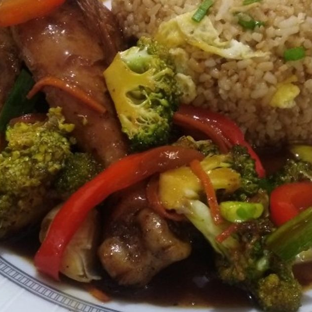 Pollo adobado en salsa oriental con verduras acompañado de nuestro riquísimo arroz chaufa de la casa.