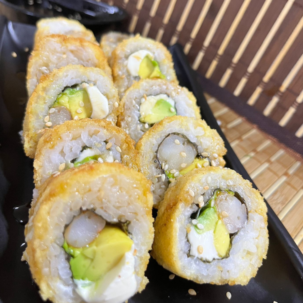 Arroz, alga nori relleno de queso crema, salmón, aguacate y empanizados por fuera y fritos.