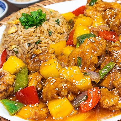 Pollo empanizado bañado en una salsa oriental con verduras, acompañado de un arroz chaufa de la casa.
