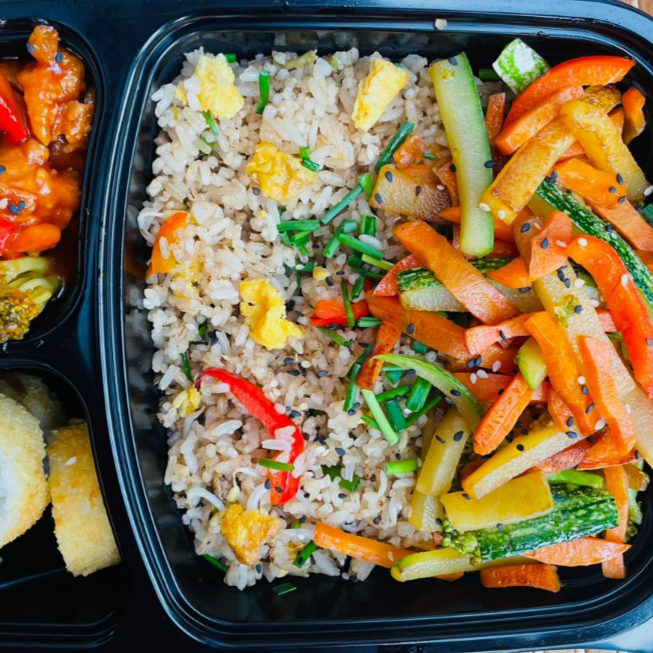 Arroz chaufa o tallarín saltado , acompañado de shop suey ,4 bocados de sushi tempura y puedes elegir tu proteína favorita disfruta de tu bebida 250ml.