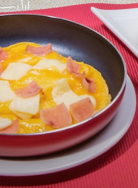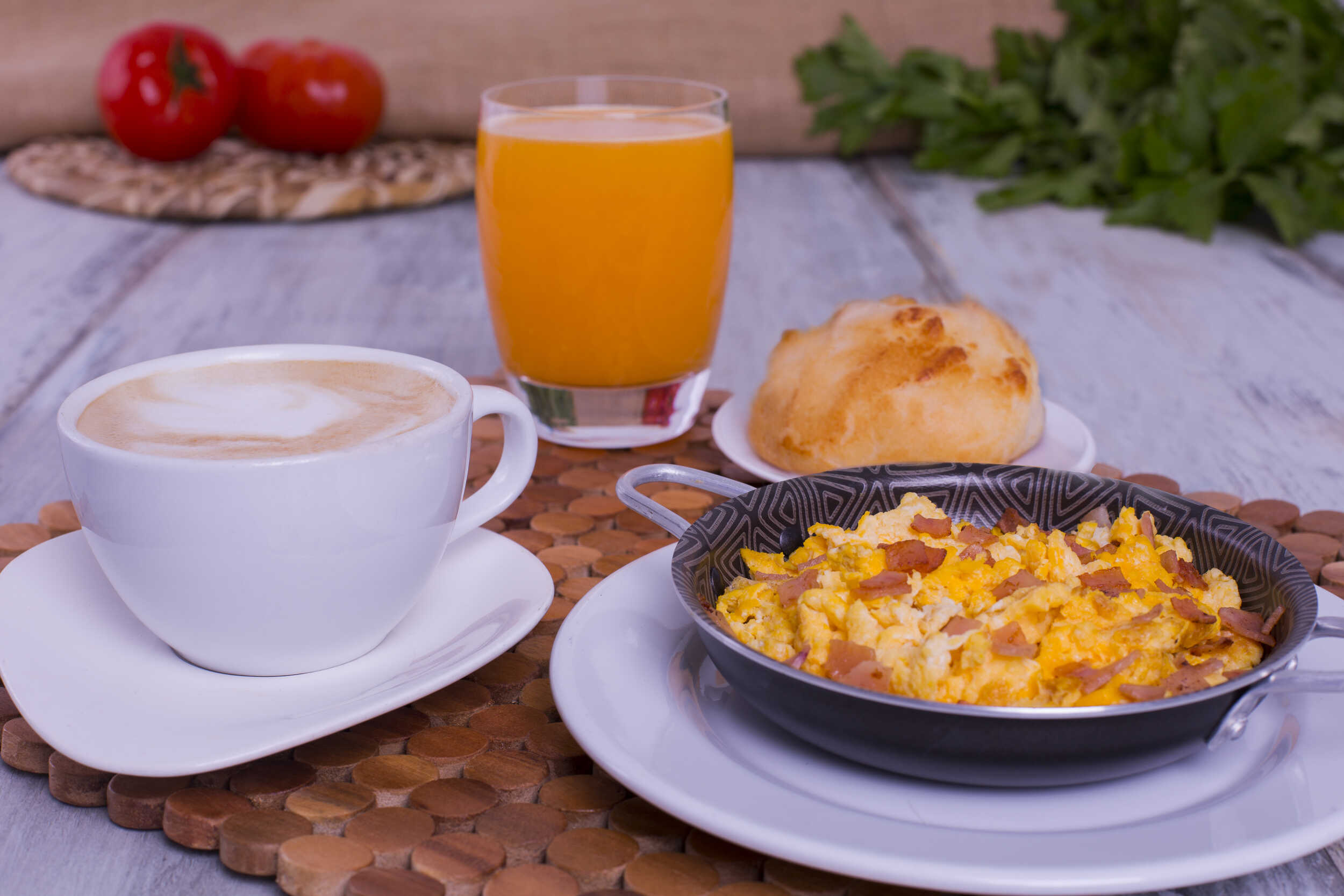 Jugo natural, bebida caliente, huevos al gusto (pericos: cebolla larga y tomate o fritos o batidos: huevos revueltos solitos) y pan de bono.