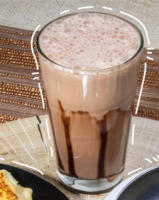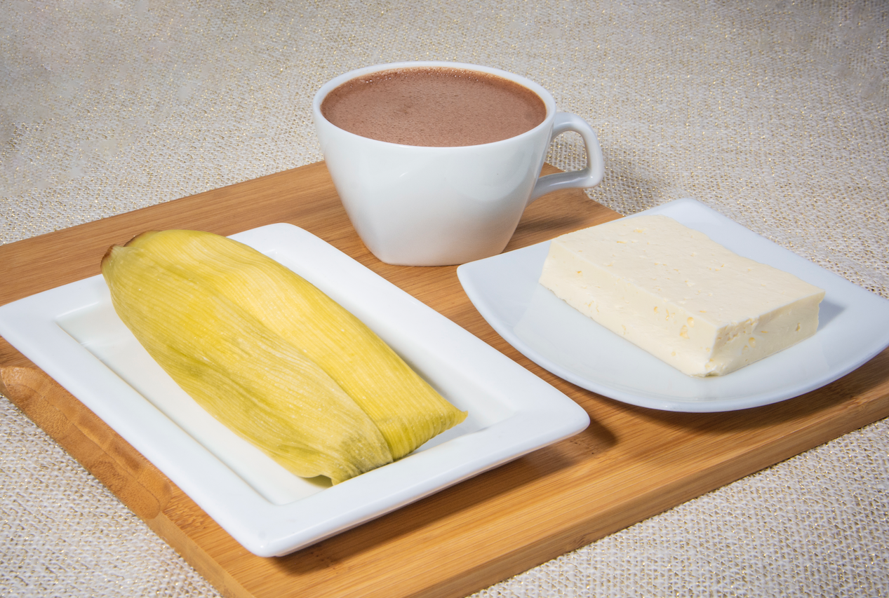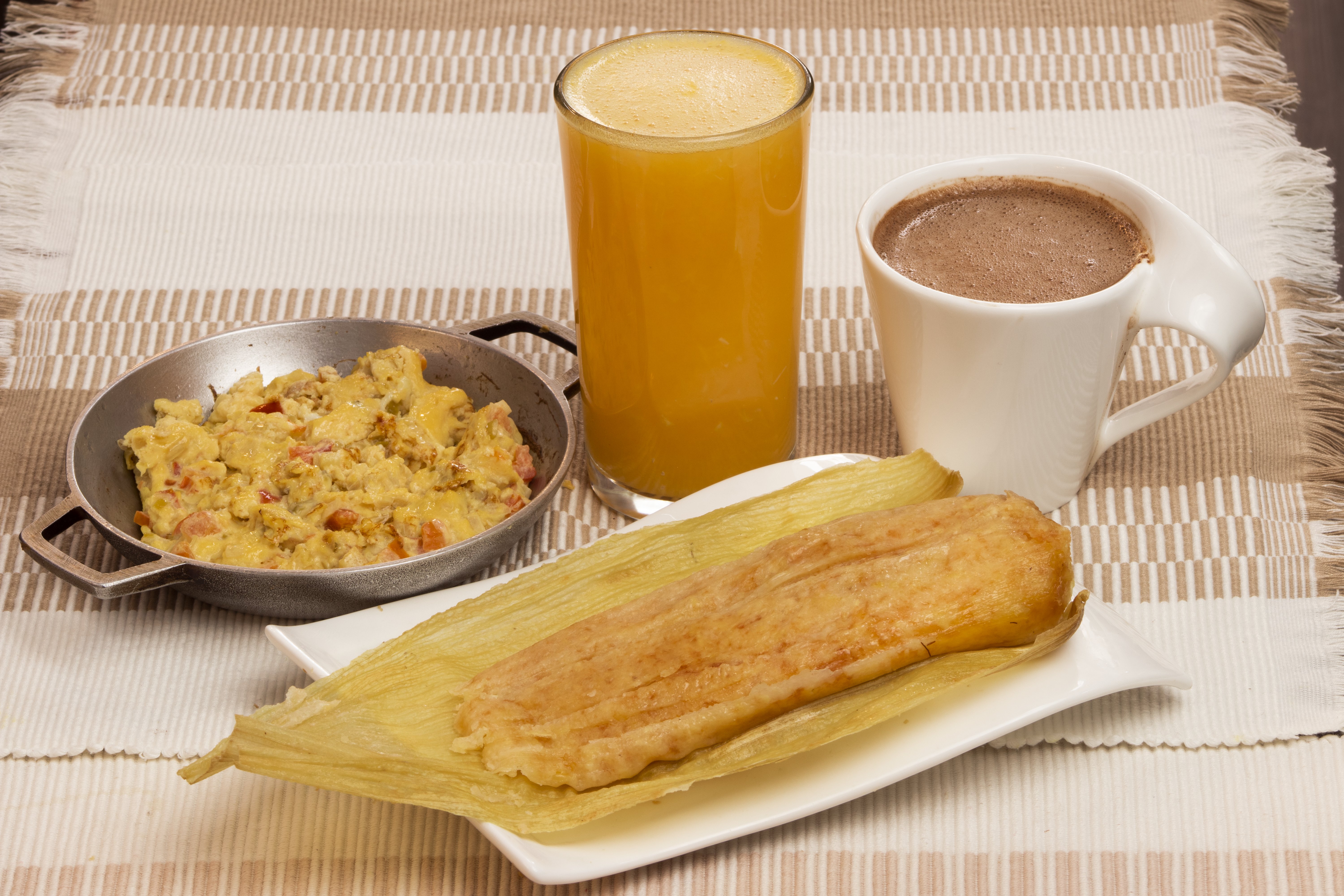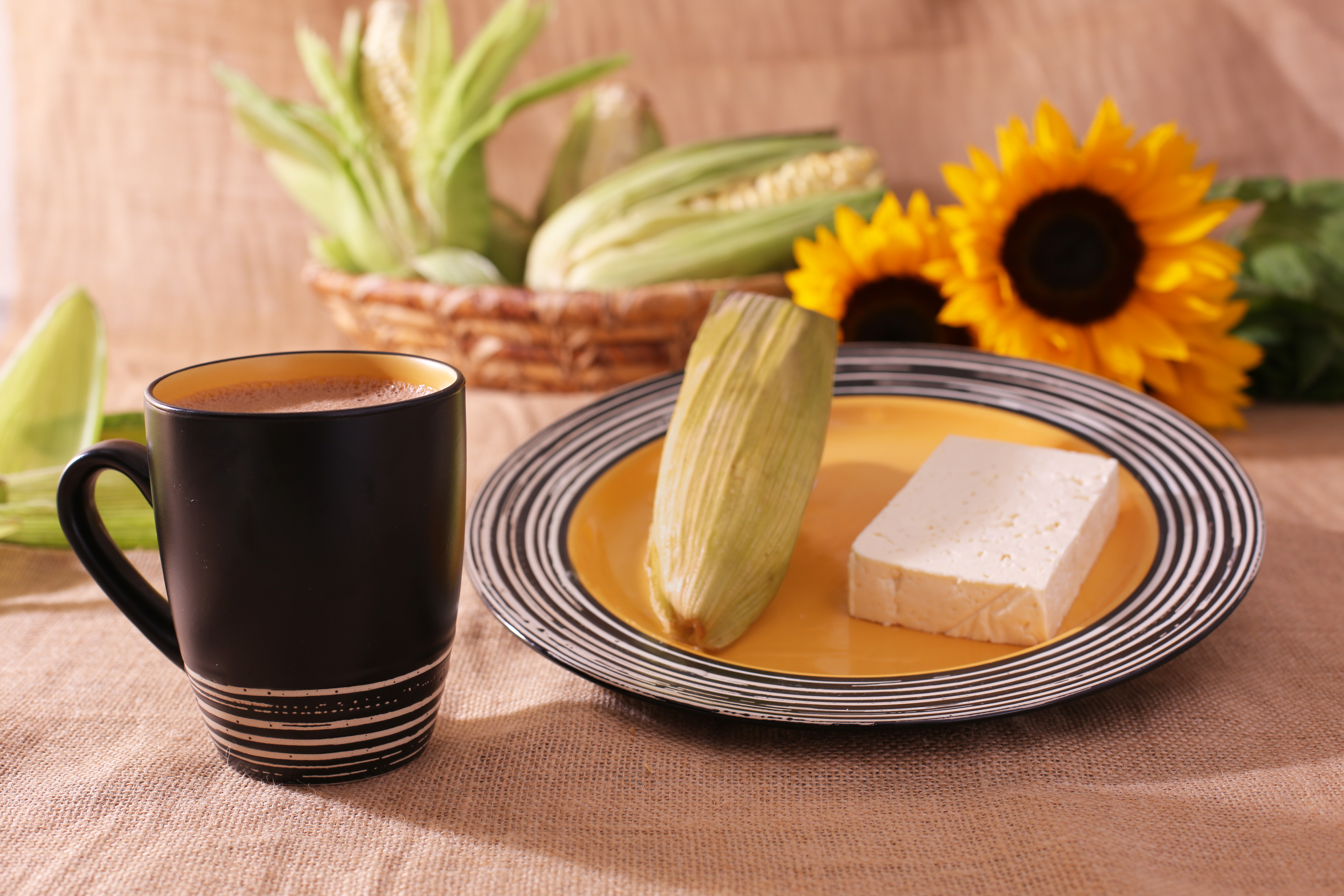 Arepa de chócolo con bebida caliente huevos al gusto.