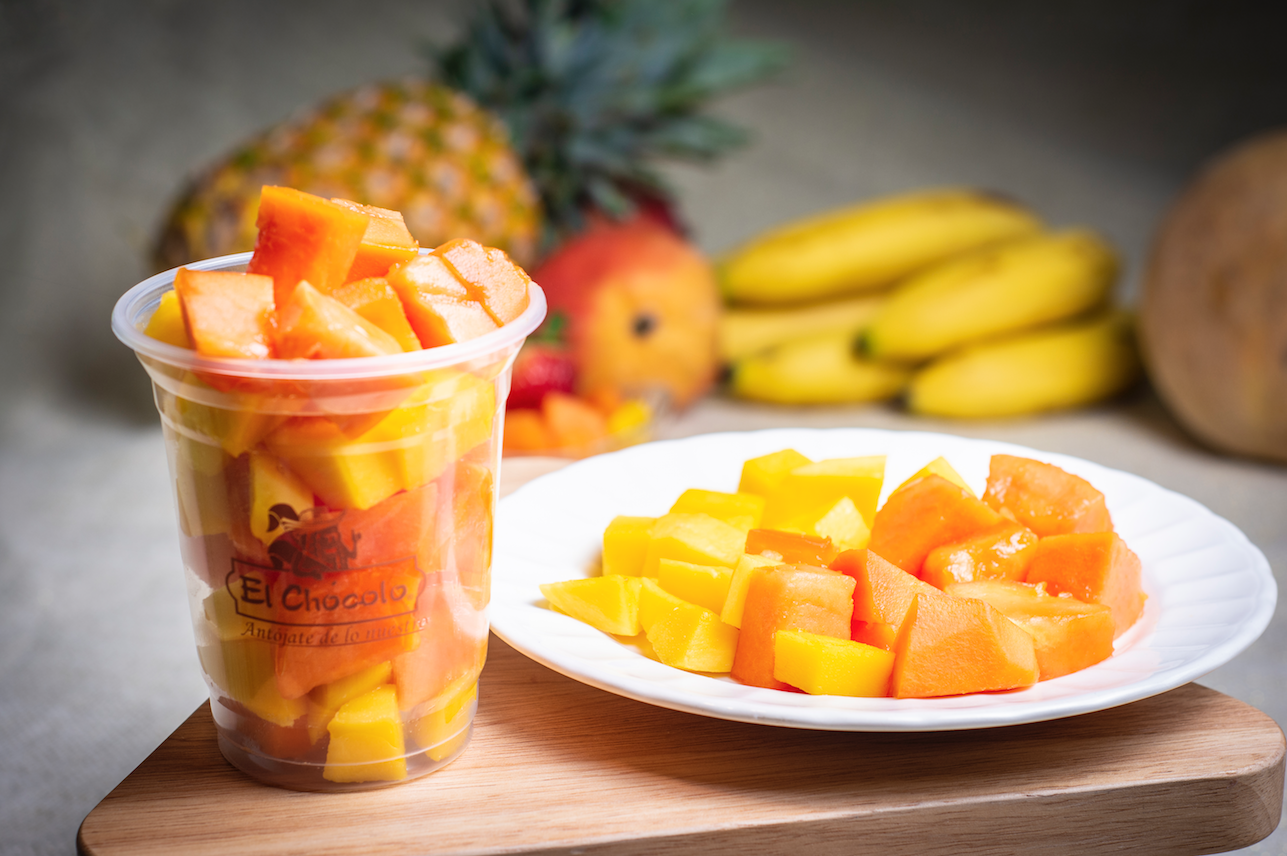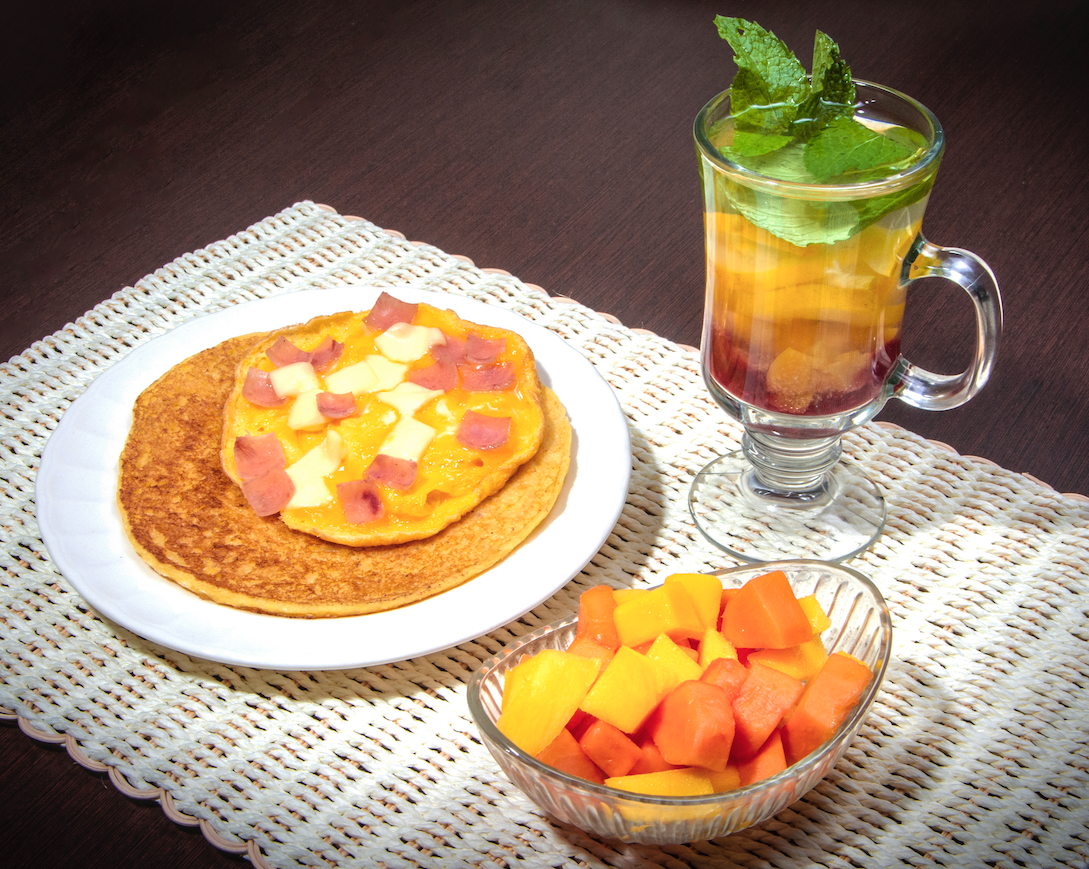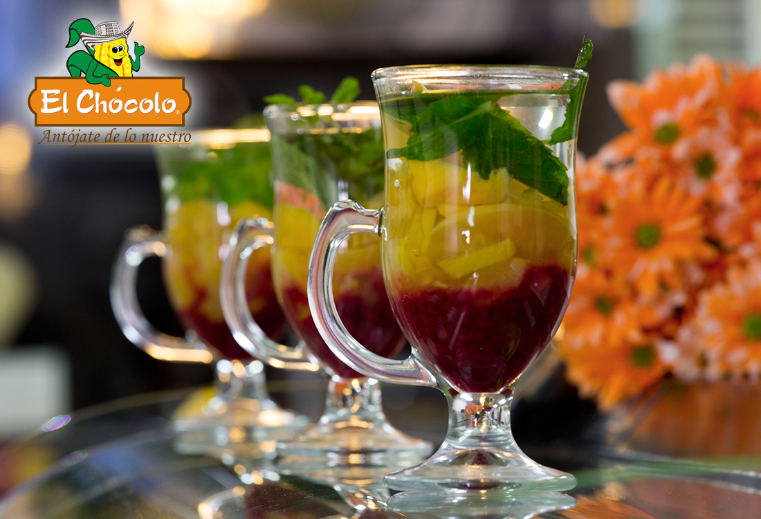 Huevos al gusto (pericos: cebolla larga y tomate o fritos o batidos: huevos revueltos solitos), aromática de frutas, arepa de chócolo y fruta.