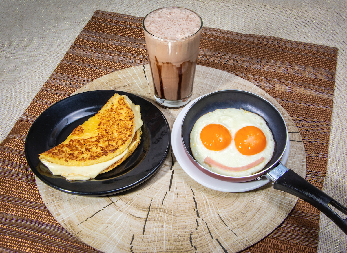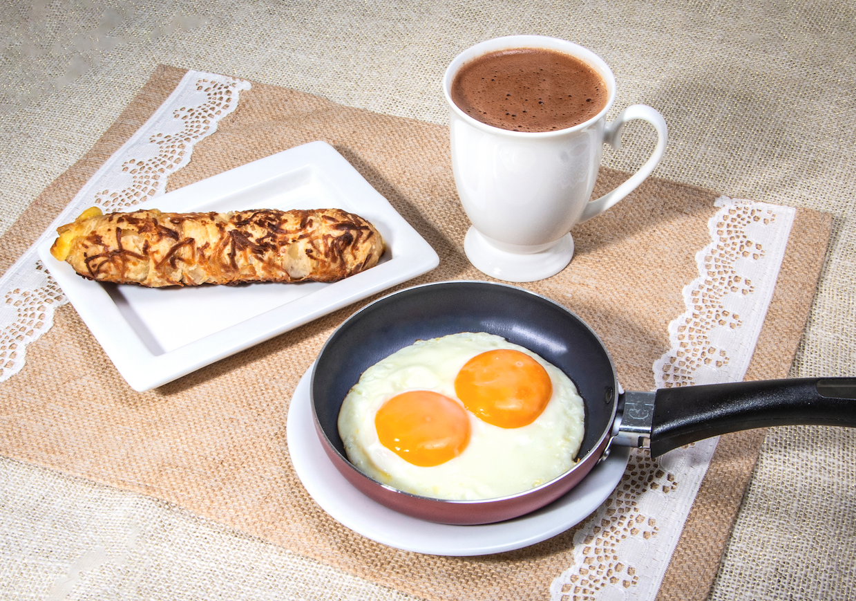Huevos al gusto (pericos: cebolla larga y tomate o fritos o batidos: huevos revueltos solitos), chocolate, jugo de naranja y envuelto.
