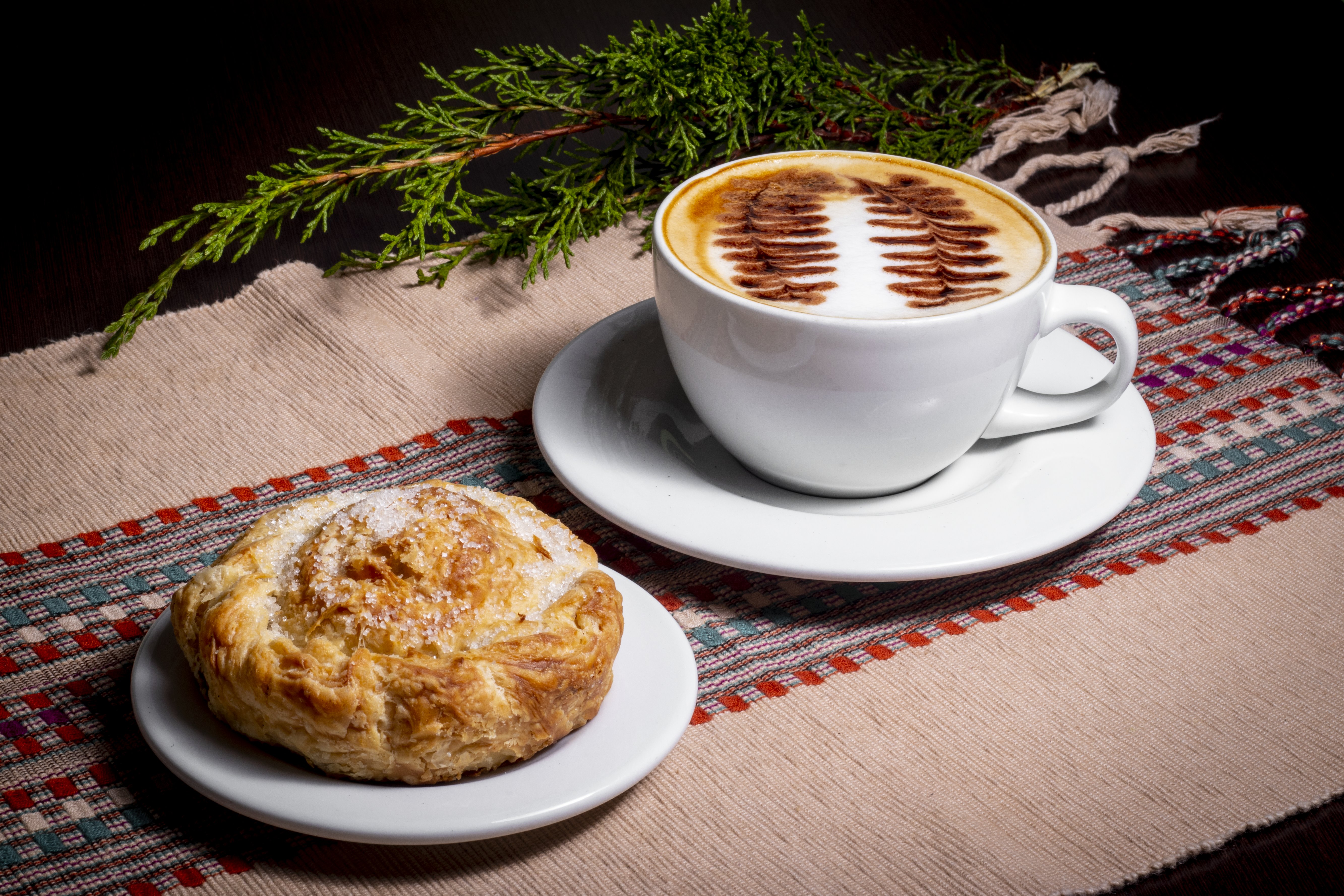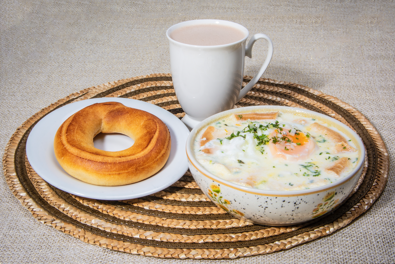 Changua con queso y amasijo, bebida caliente, chocolate, latte.