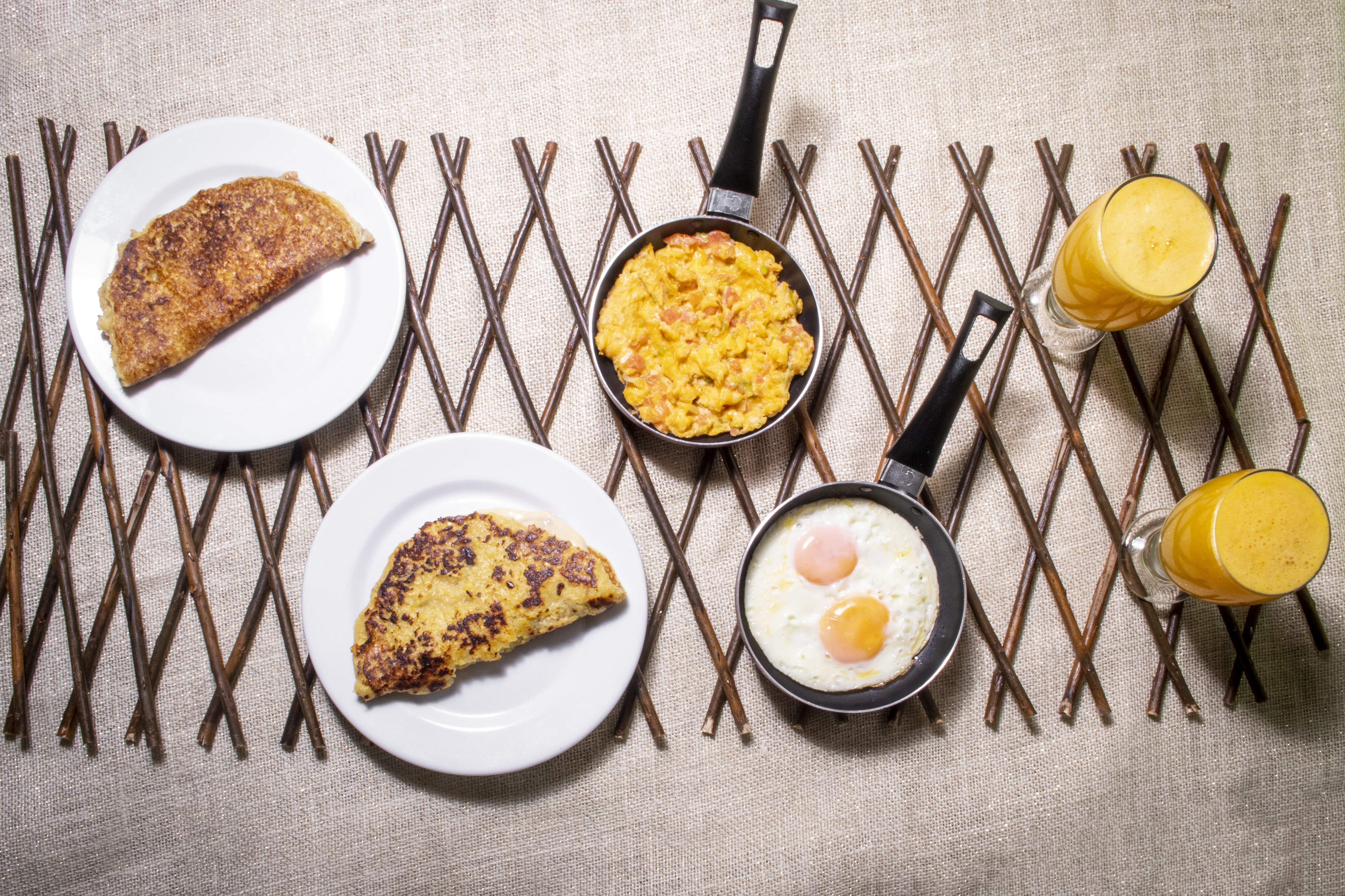 2 Jugos de naranja, 2 arepas de chócolo, jamón queso, solo queso o sencilla, 2 huevos al gusto.