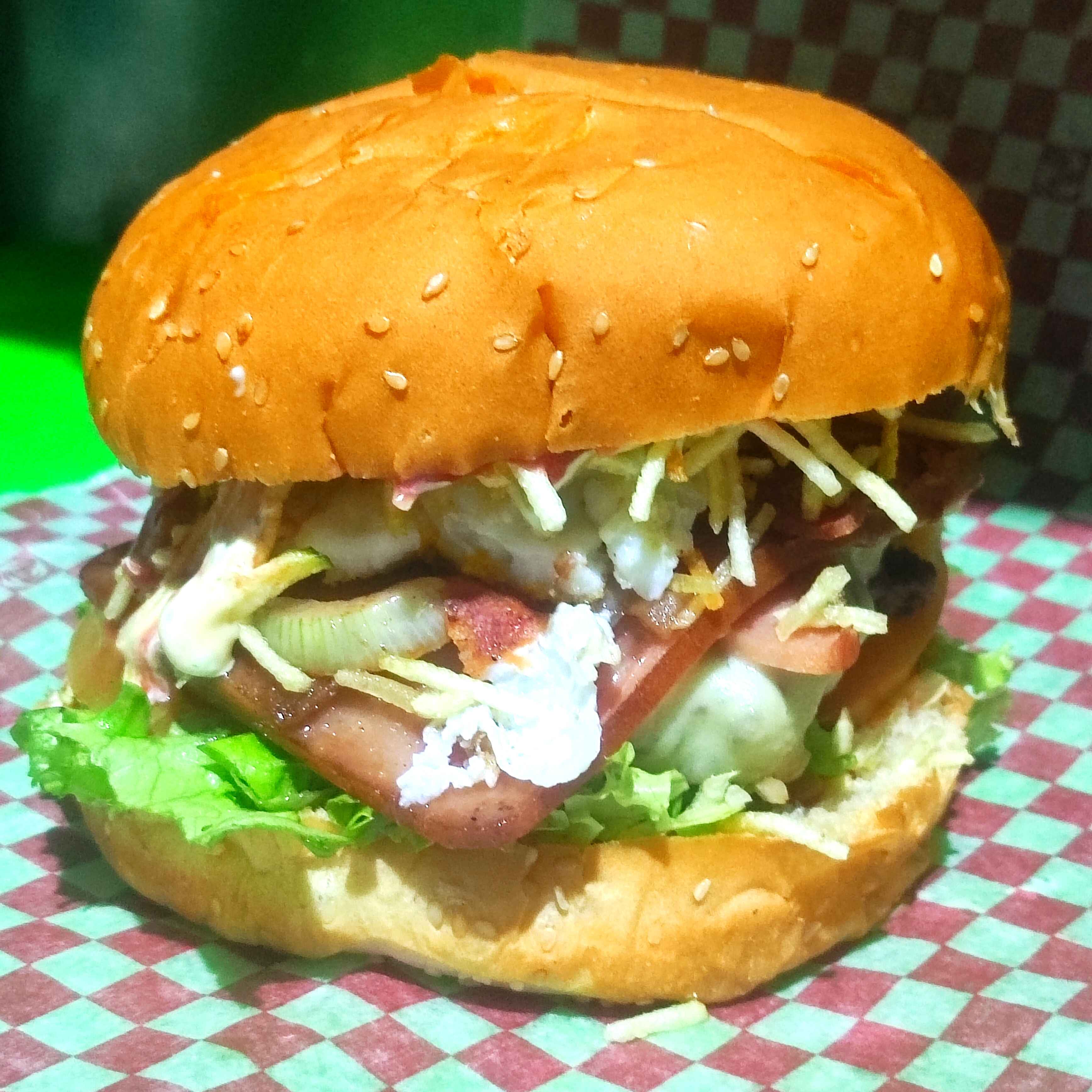 Pan de ajonjolí, carne de buena calidad 140, jamón, doble crema, cebolla caramelizada,salsa de casa papas chik, tomate y lechuga