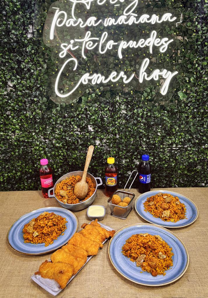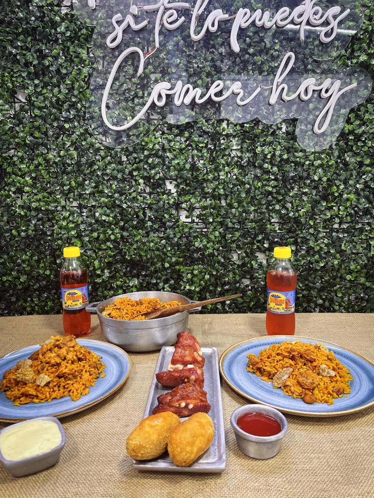 2000 grs de arroz ranchero, 5 croquetas de maduro, 2 porciones de papa 100 grs, 400 grs de trozos de chicharron, guandolo 2 lt o gaseosa 1.5 lt