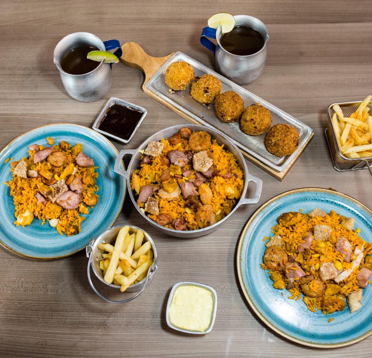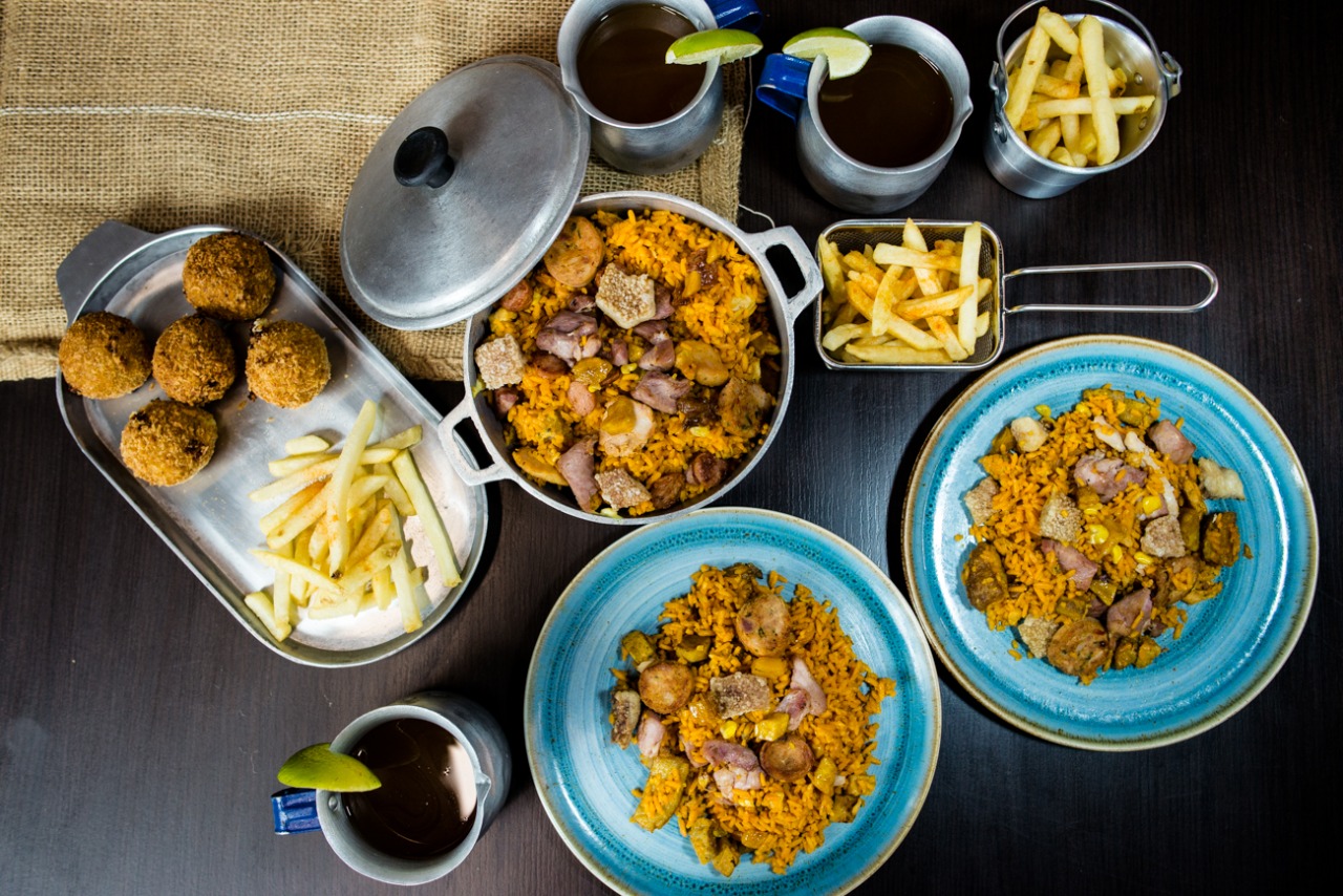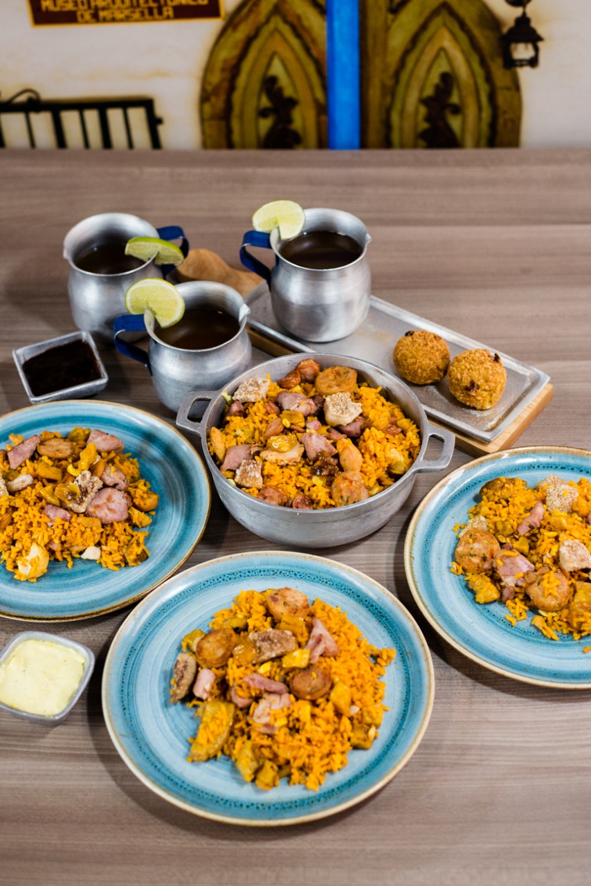 1300 grs de arroz (Montañero o carnes ahumadas), 5 croquetas de maduro. 3 porciones de papa 100 grs y 3 bebidas 250 ml