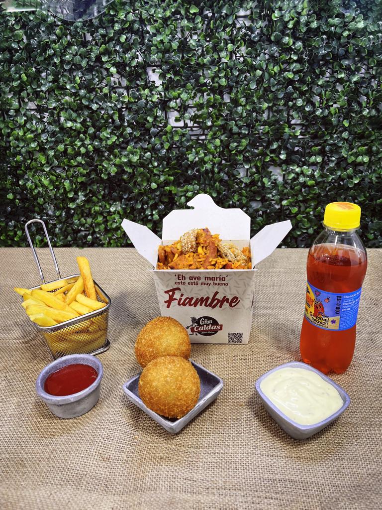 Arroz fiambre 500 gramos + 2 croquetas de maduro + 1 porción de papas francesa 100 gramos + gaseosa postobón 250ml