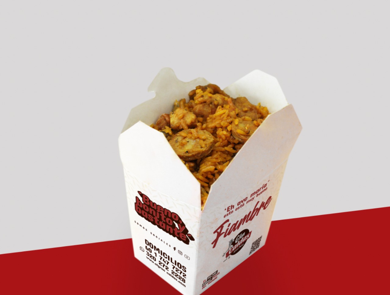 400 grs de arroz paisa, 100 grs papa, 200 grs trozos de chicharron y una bebida 250