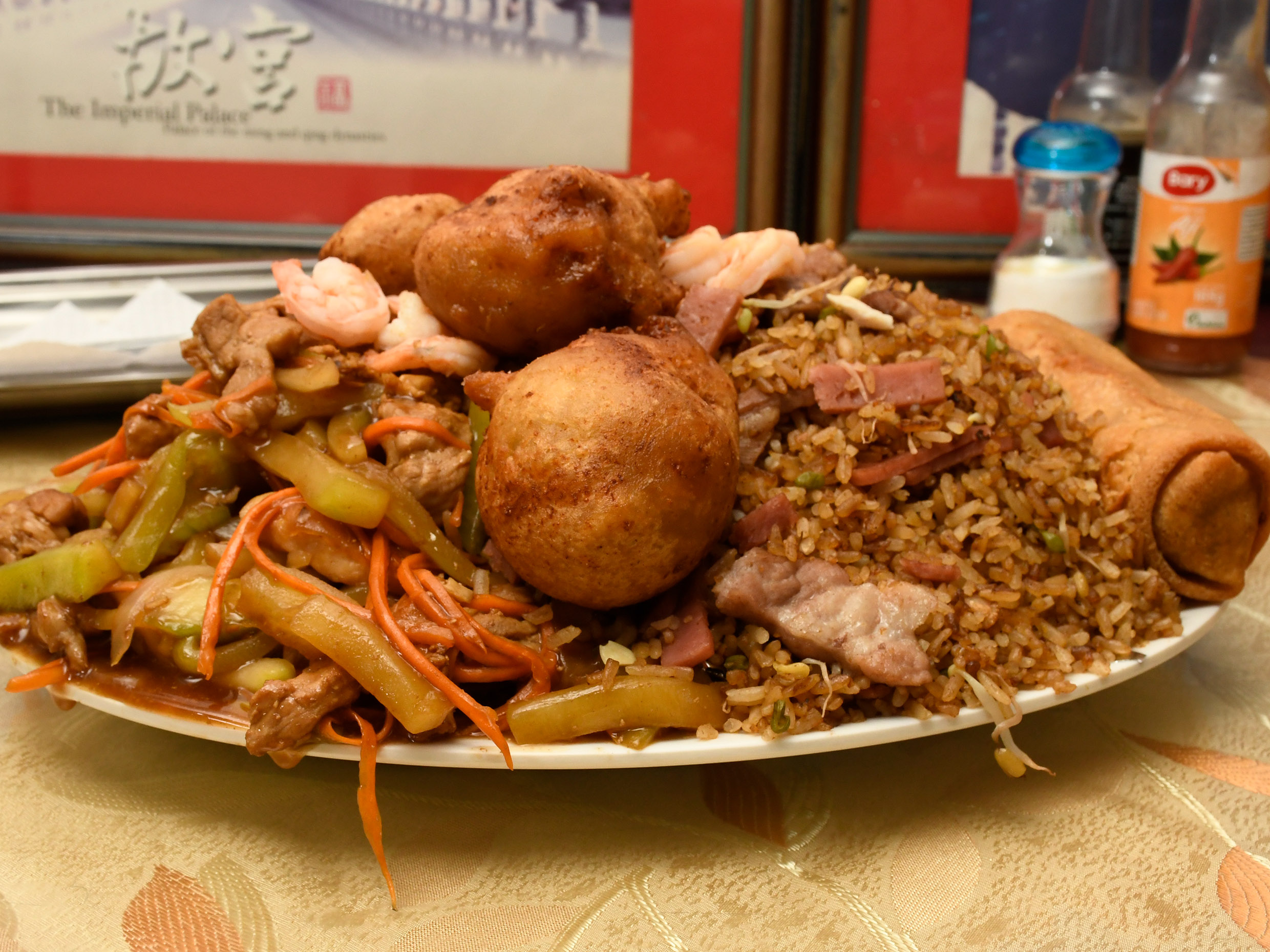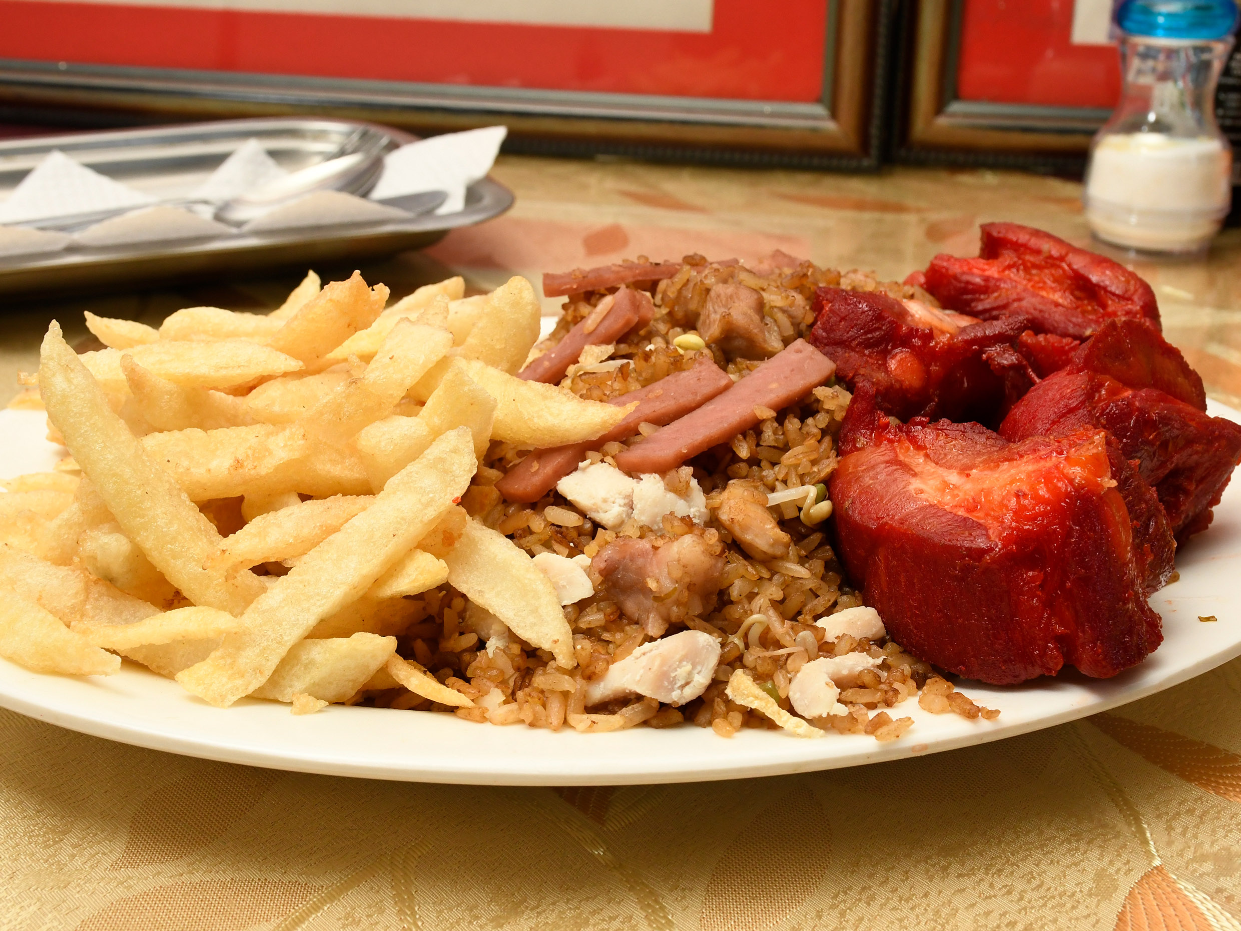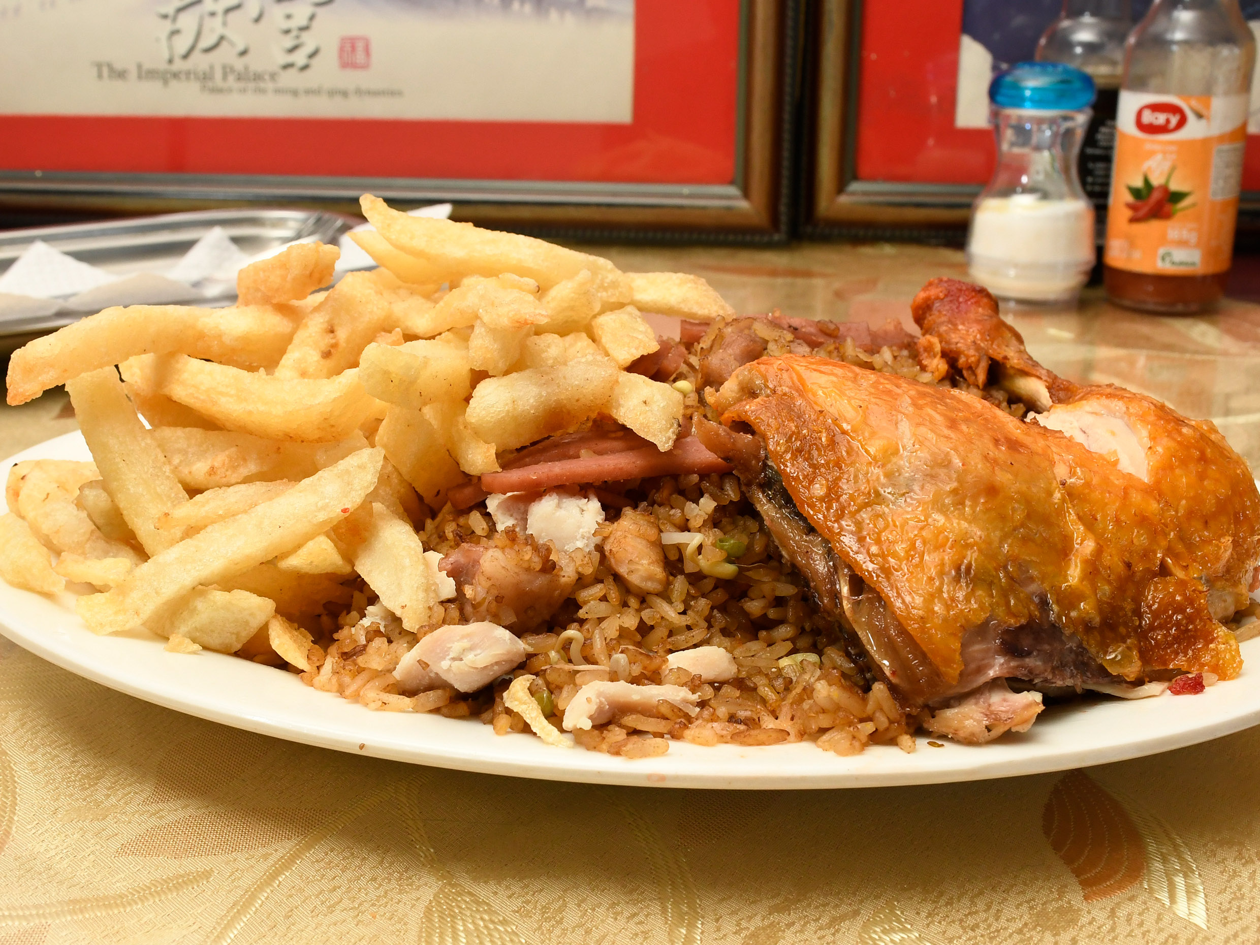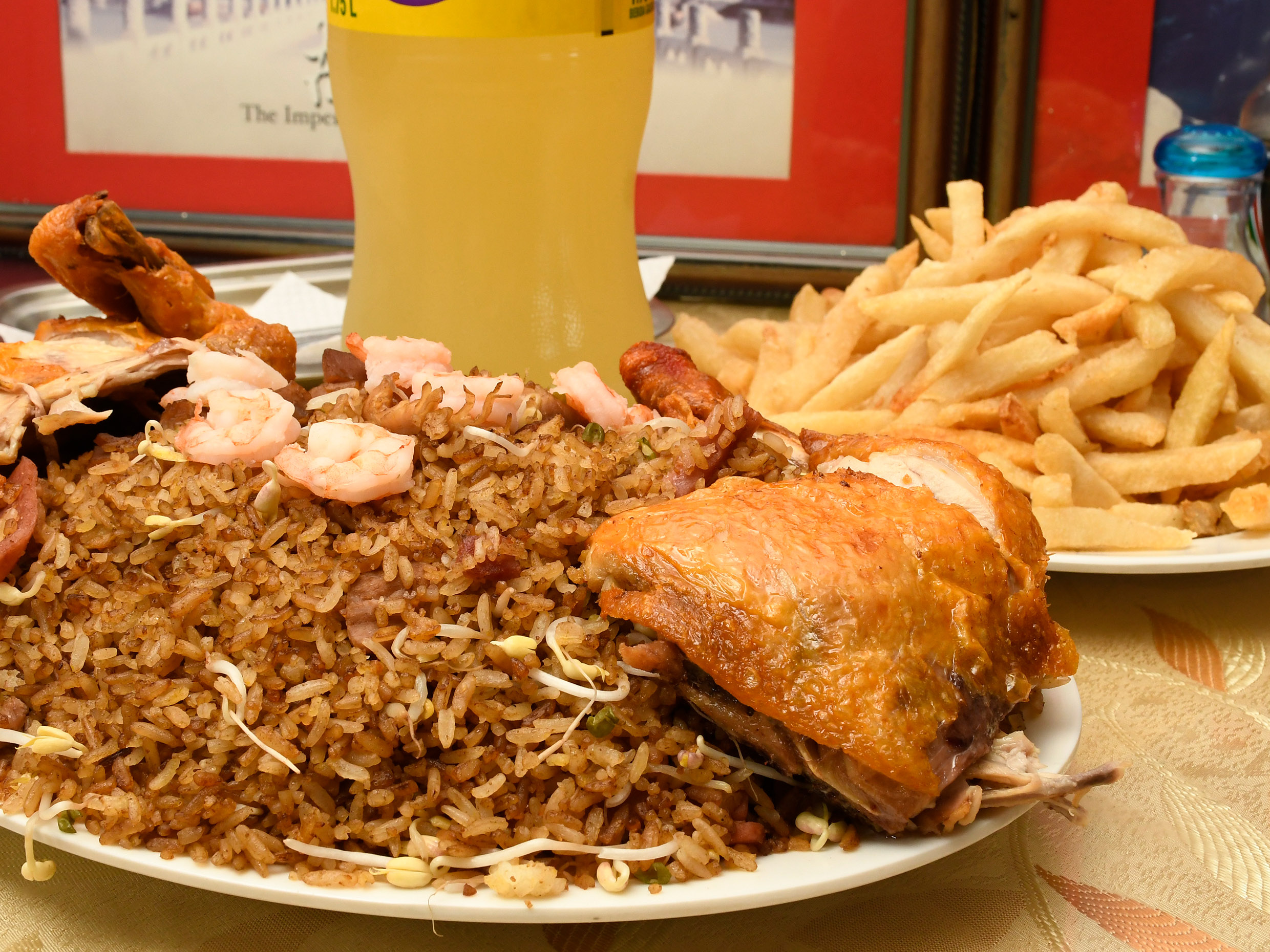 arroz chino ( jamon, cerdo ,pollo) 4 bolitas agridulce y papa francesa alcanza para dos personas