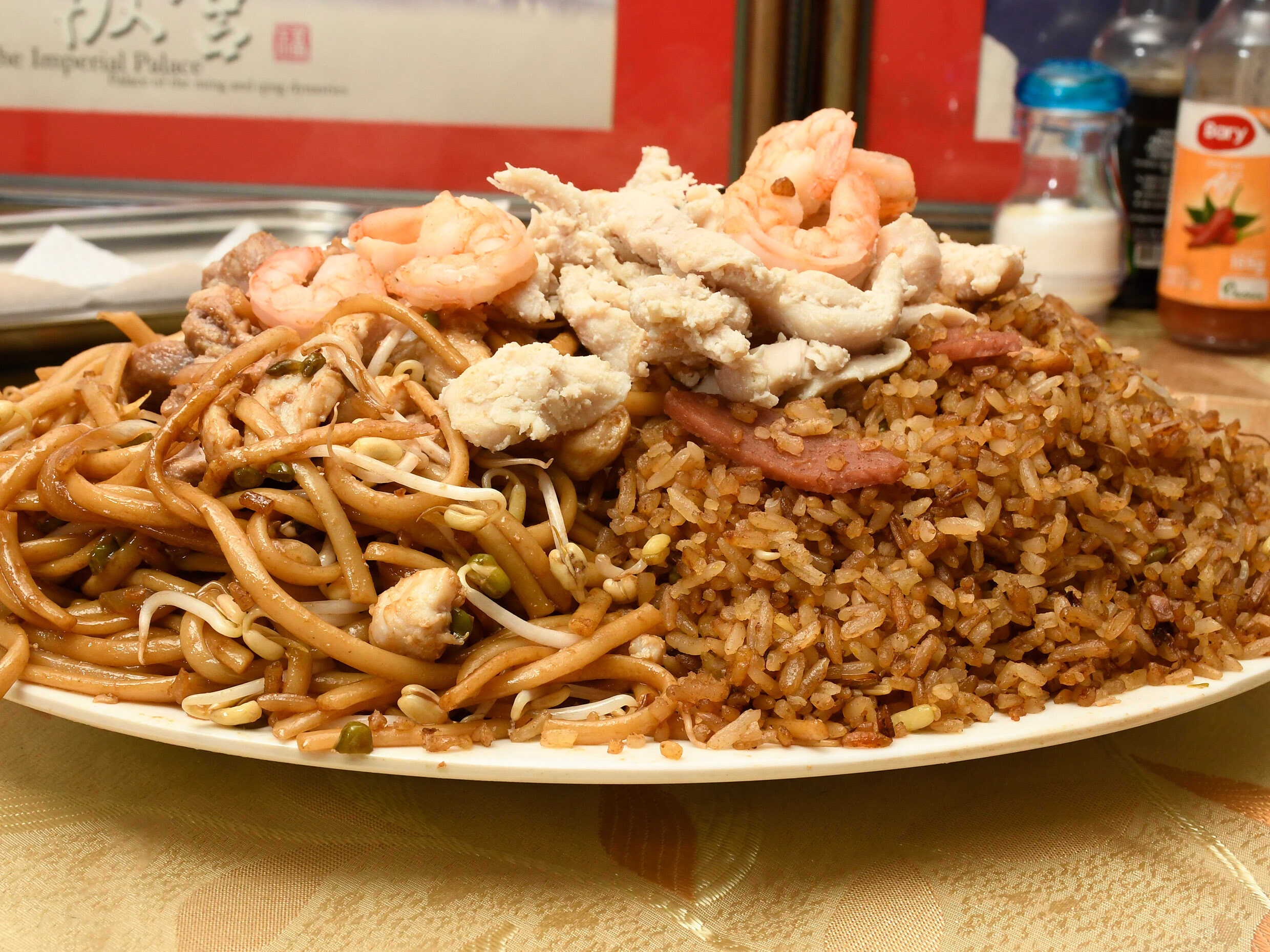 1/2 Arroz Chino con raices*1 + 1/2 Lomein (Spaguetti)*1 + Camarón, Pollo, Cerdo*1