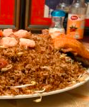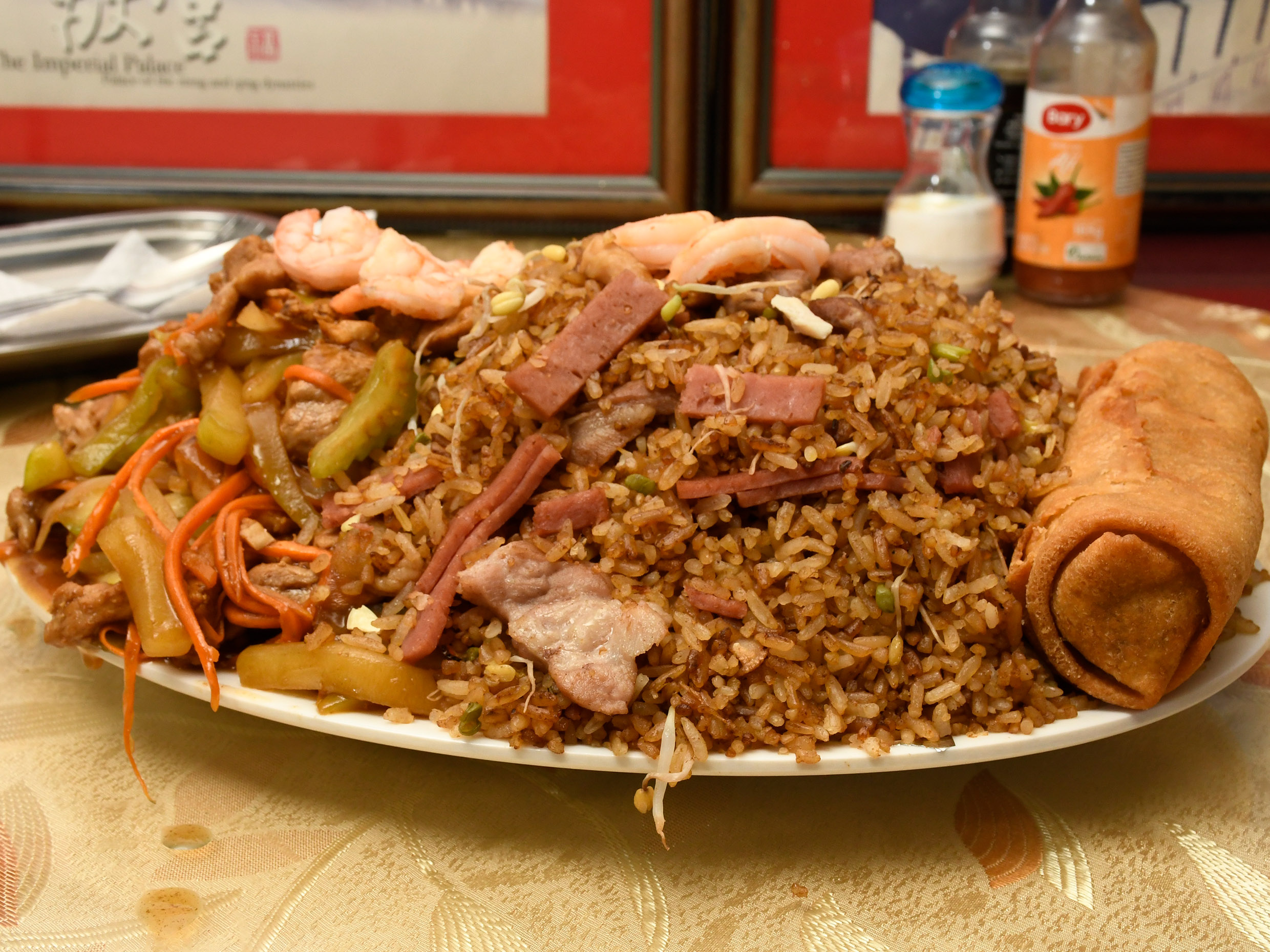 arroz chino ( jamon, cerdo, pollo y 5 camaron) 1 Ala apanada , 1 Lumpia. alcanza para 4 personas