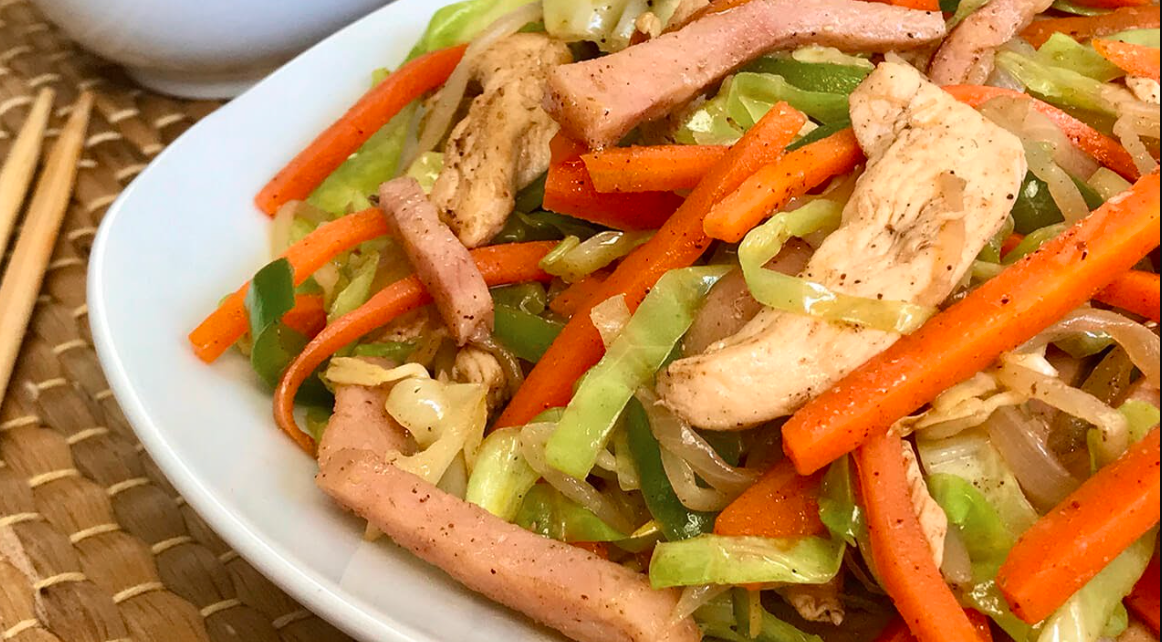 1/2 Arroz con raíces, 1/2Chop Suey (cebolla, pepino, apio, calabaza, zanahoria), pollo, cerdo, camarones (Alcanza 3 personas).