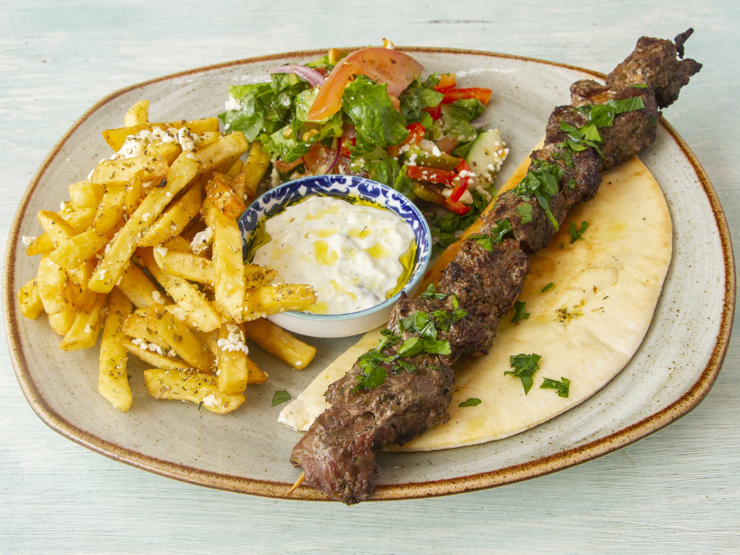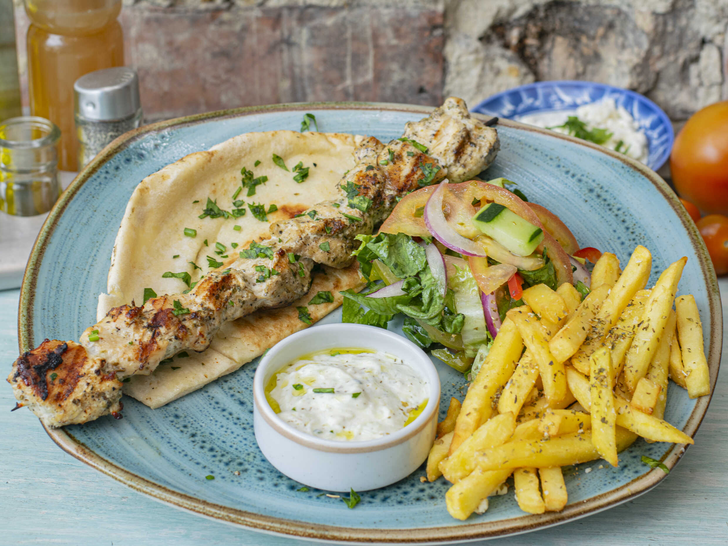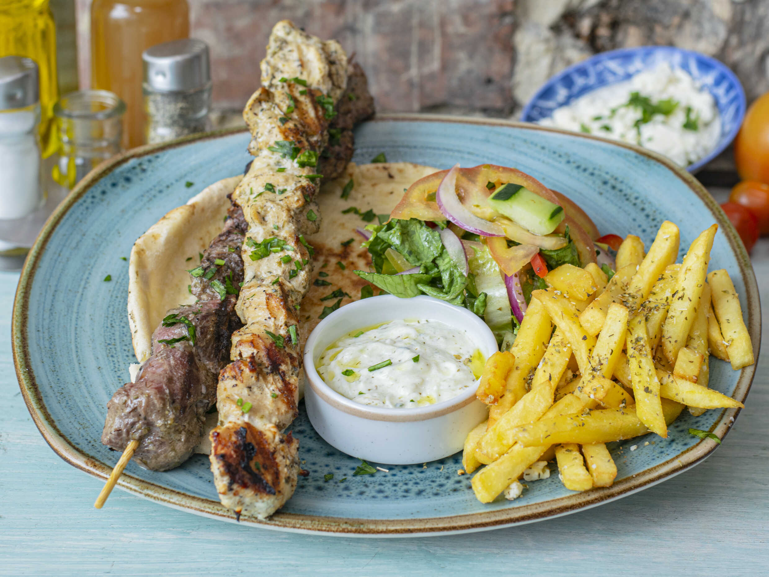 Brocheta asada, acompañada de tzatziki y papas griegas.