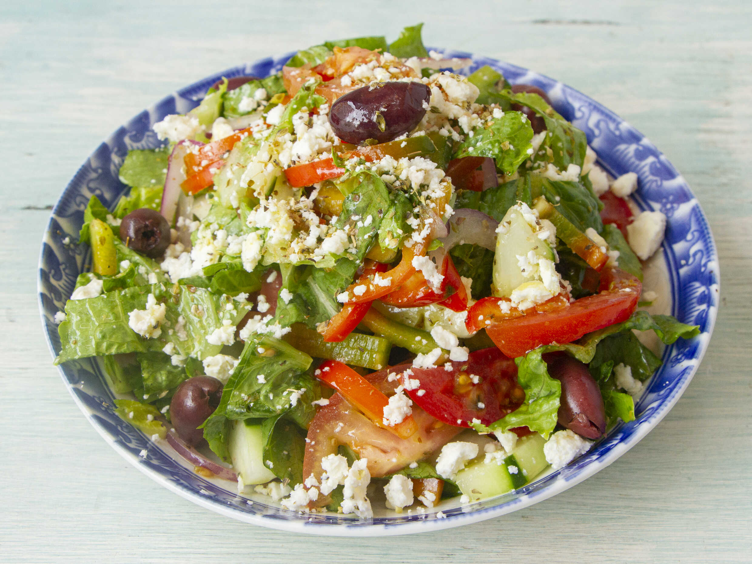 Tomate, pimentón, pepino europeo, cebolla, queso feta y aceitunas.