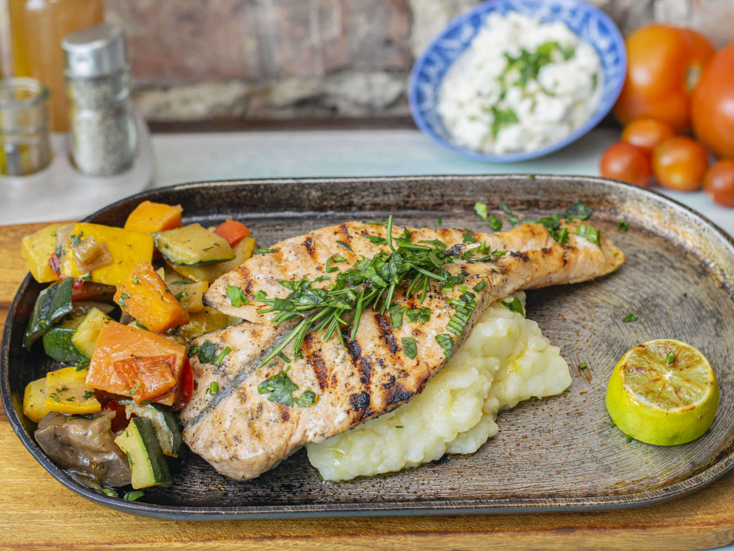 Salmón a la parrilla con puré de papa y verduras salteadas.