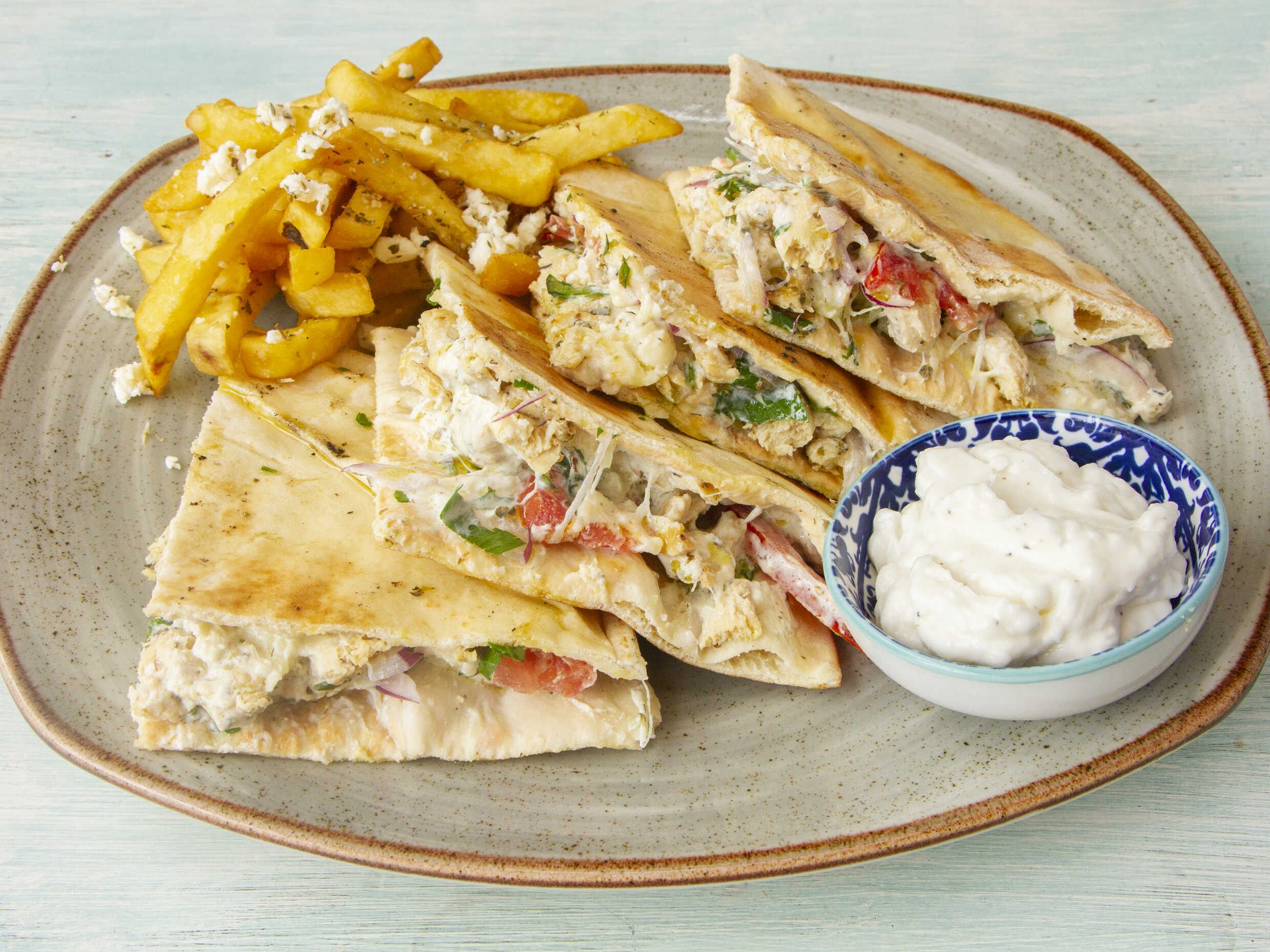 Sándwich de pita, queso parmesano, tomate, cebolla, tzatziki y papas griegas.