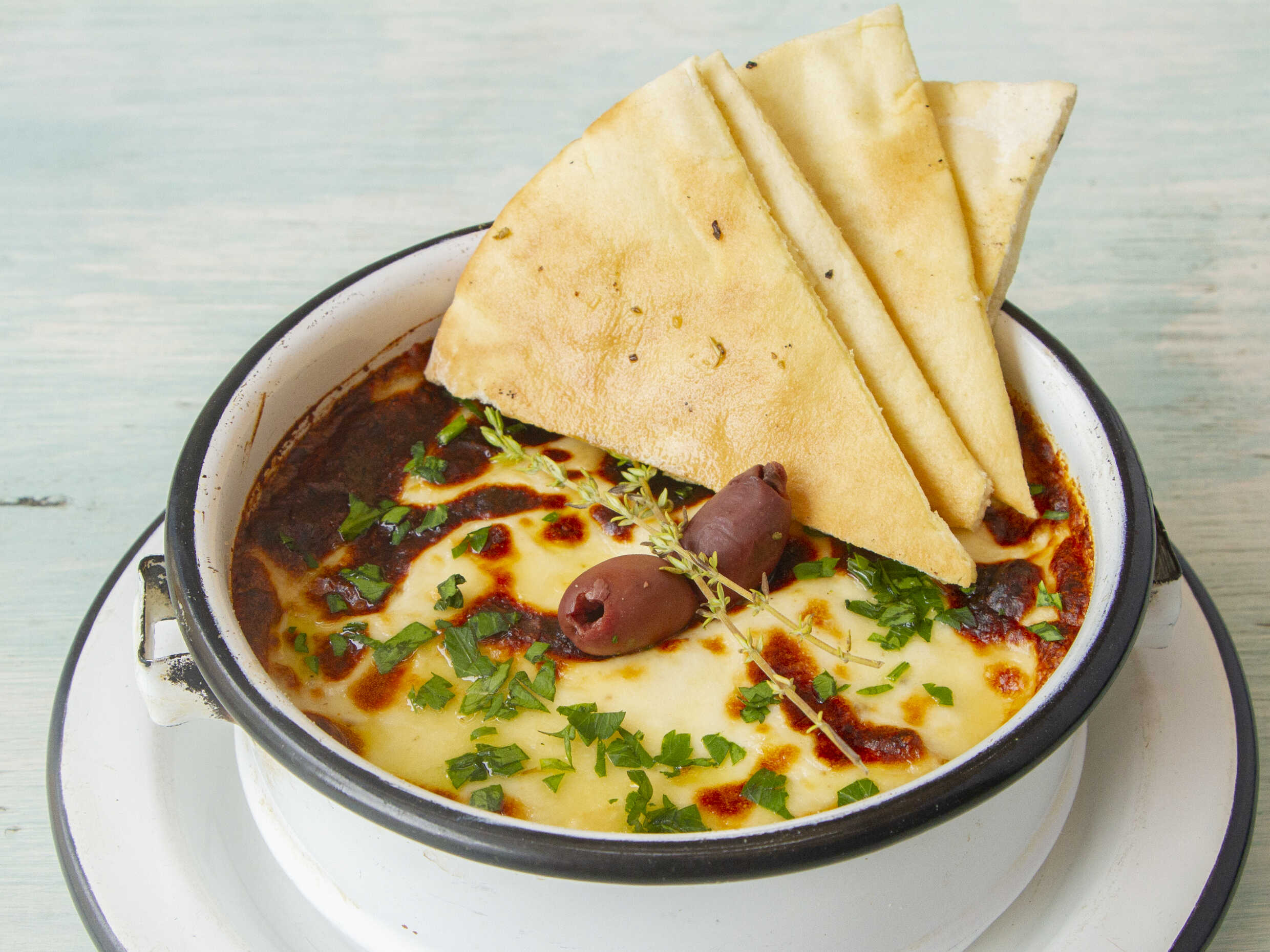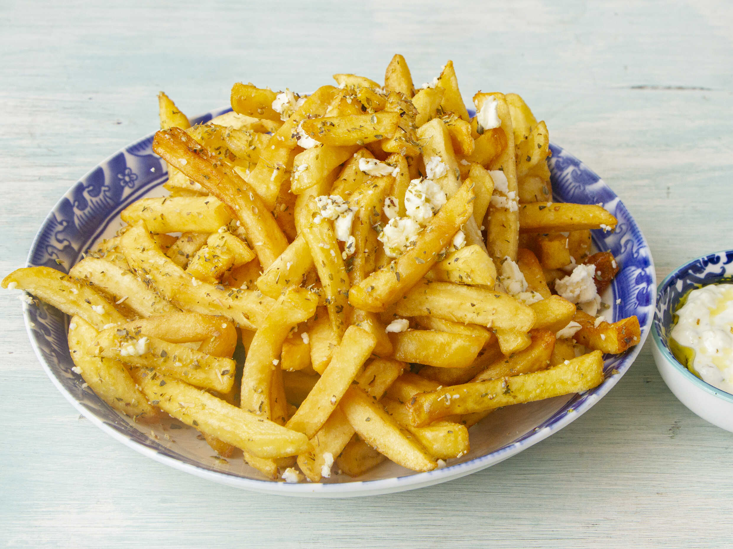 Papas griegas con queso feta, orégano y aceite de oliva.