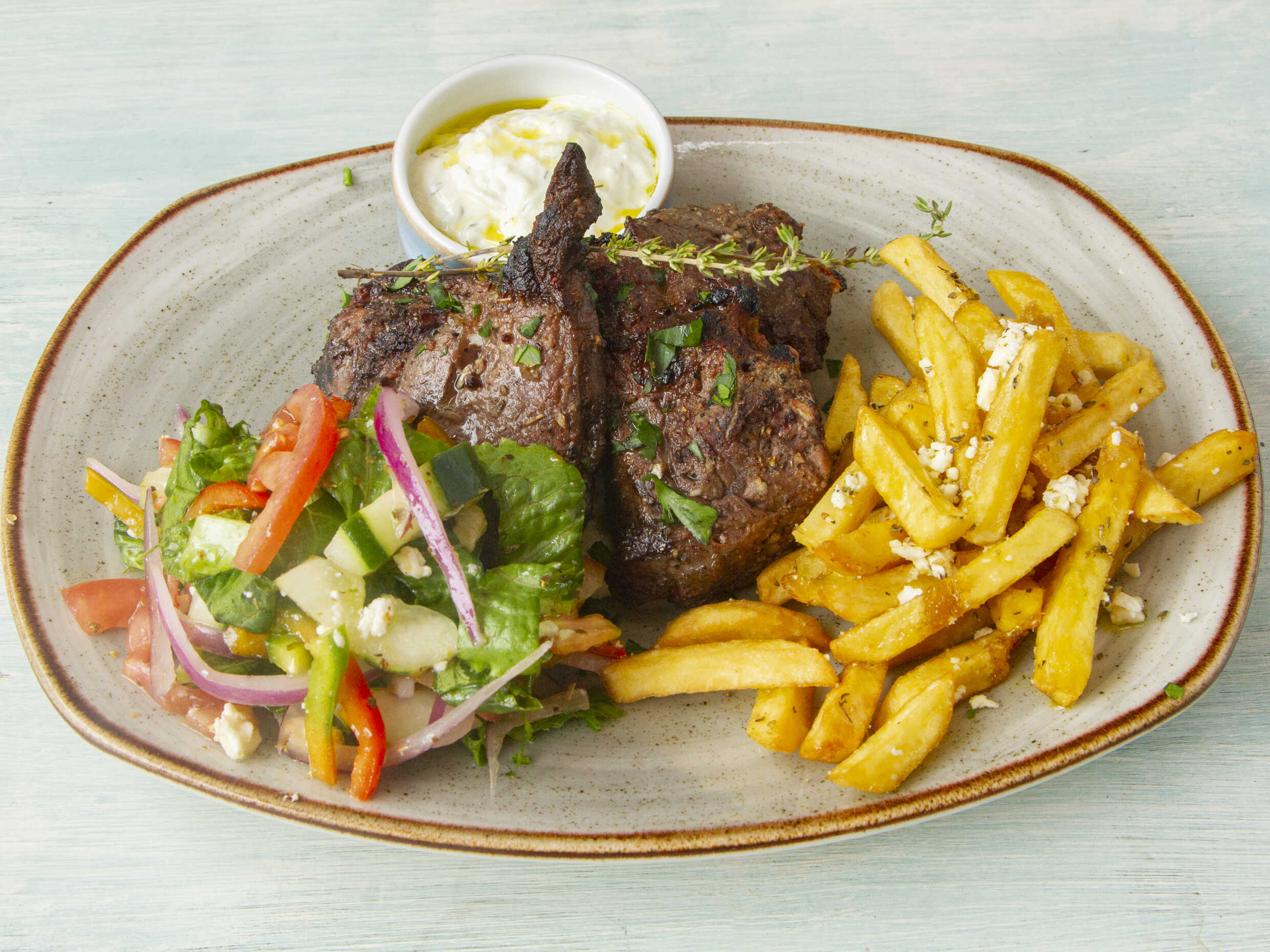 Cuatro chuletas a la parrilla, acompañadas de papas griegas, ensalada de tomate, lechuga y tzatziki.