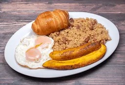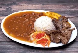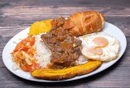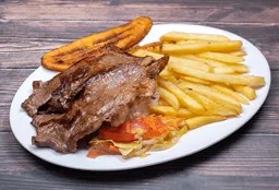 Consta de carne en bistec, huevos, arroz, tajadas y ensalada.