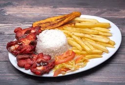 churrasco de 200gramos aprox, Acompañado de papa francesa (120 gramos), arroz ( porción personal), ensalada, tajadas o papa sudada , sopa de 16 onzas y jugo de 7 onzas