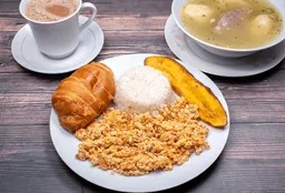 Caldo de pollo o costilla Huevos al gusto Chocolate o limonada