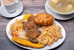 Sopa del día, Frijol - arroz - tajadas + carne molida o asada - chicharrón - chorizo cóctel - arepa aguacate huevo y limonada