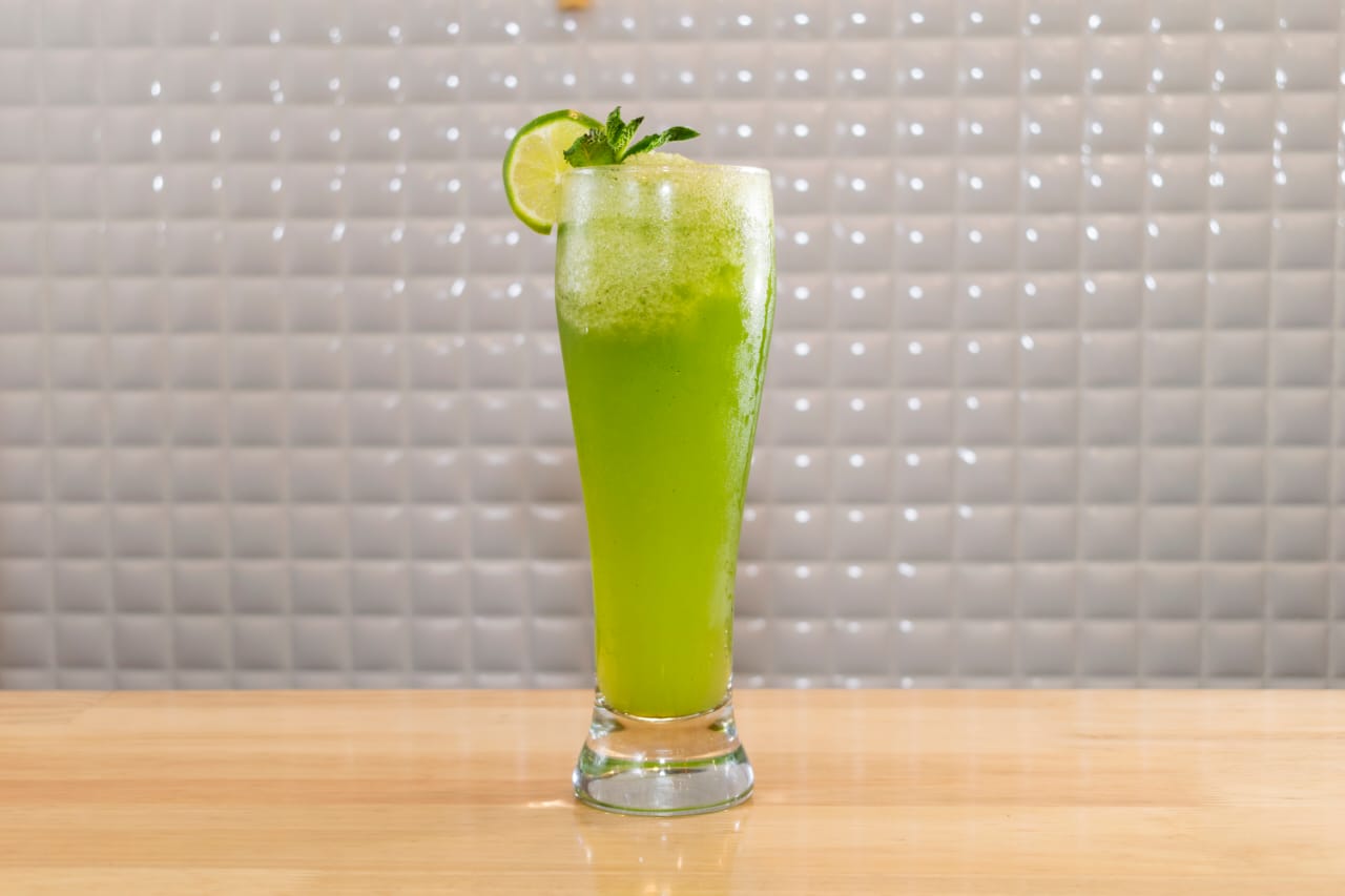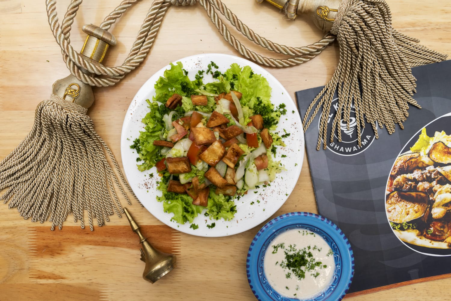 Lechuga, pepino cohombro, cebolla, tomate, hierbabuena, perejil, aderezo de la casa y pan árabe frito.