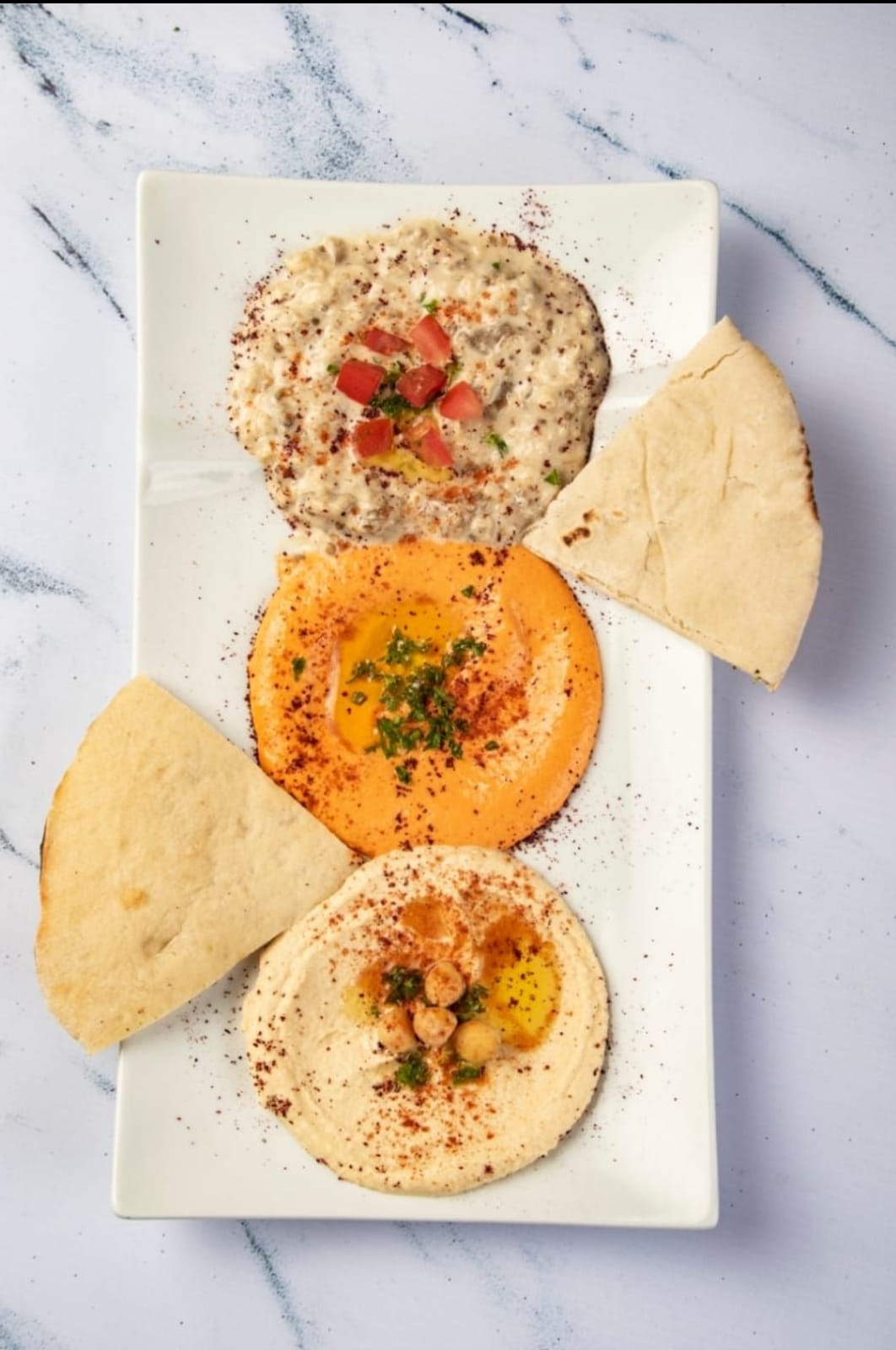 Hummus, tahine de berenjena y tahine de pimentón más pan árabe.