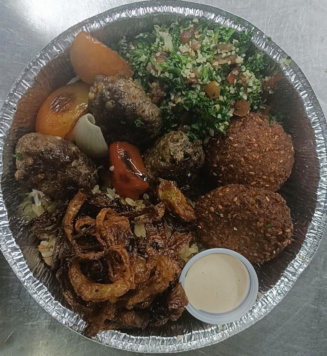 Arroz de lentejas con aros de cebolla frita, kaftan (carne molida en especias ala parrilla) falafel(croquetas de garbanzo y ajonjolí) acompañado de ensalada tabule y vegetales salteados.