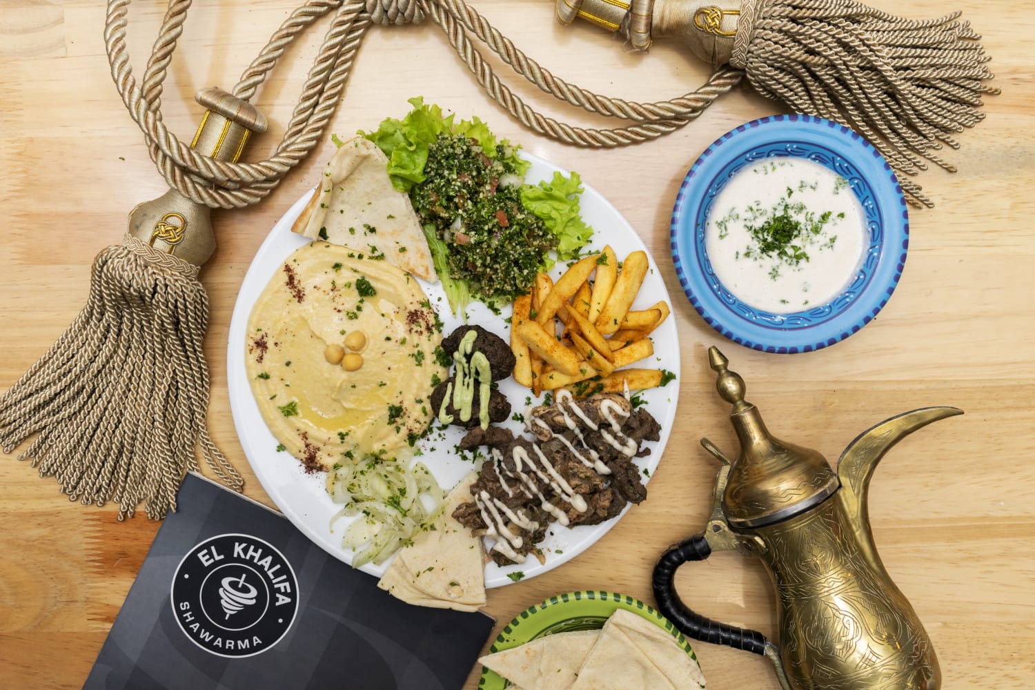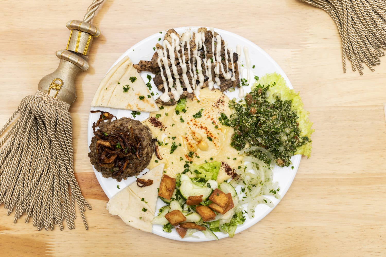 Tiras de pollo y carne shawarma sazonados, tahine de garbanzo, ensalada tabuleh, arroz de lentejas, acompañado con pan árabe.