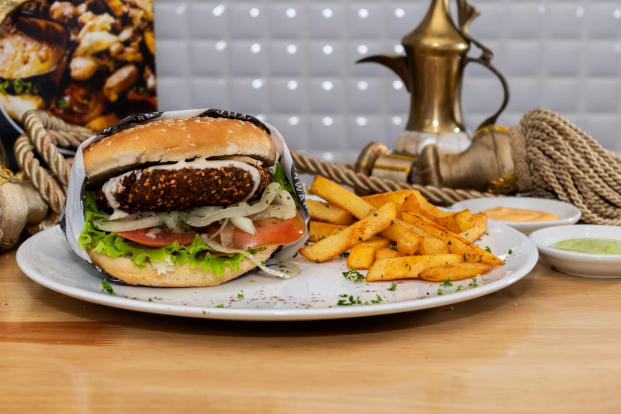 Croqueta de falafel, lechuga, tomate , salsa de ajonjolí, acompañado de papas la francesa y bebida 250 ml.