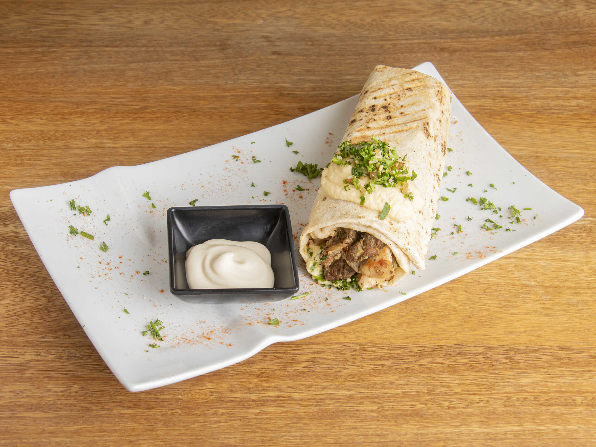 Carne y pollo shawarma, hummus, tabuleh, envuelto en pan árabe.