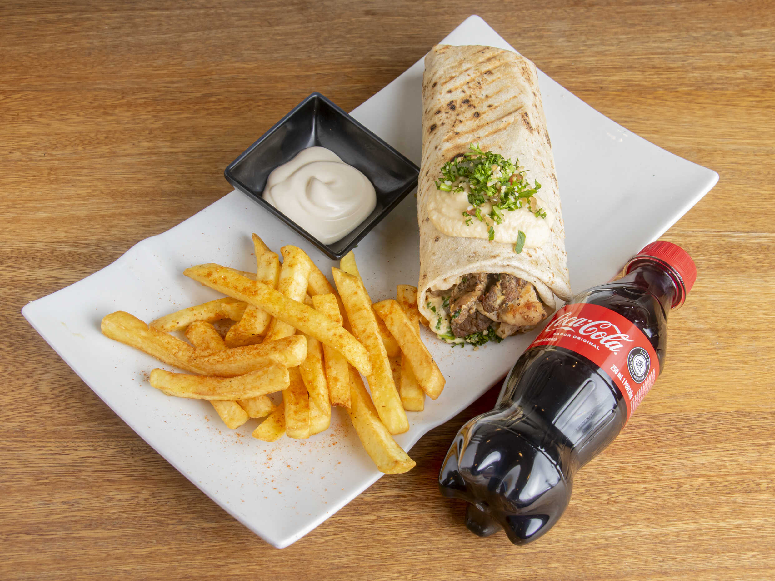 shawarma, lechuga, tomate , salsa de ajo, queso mozzarella acompañado de papas la francesa y coca cola 250 ml.
