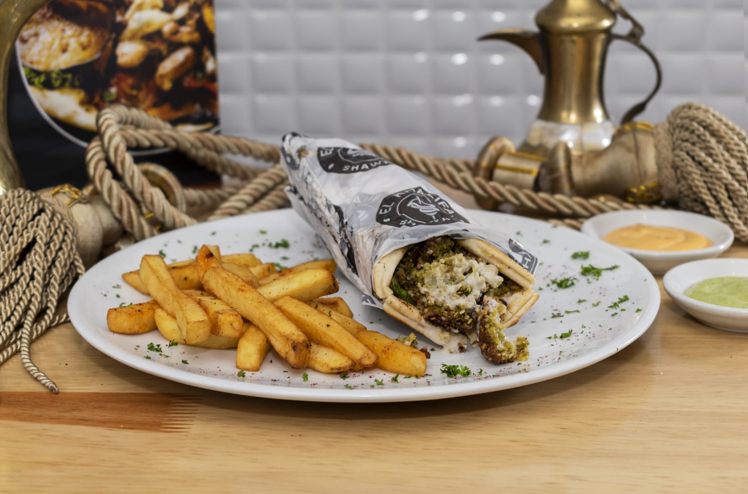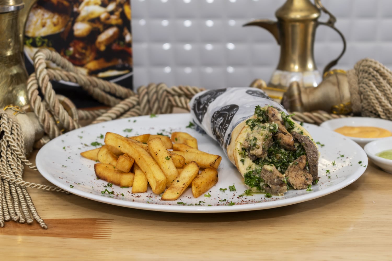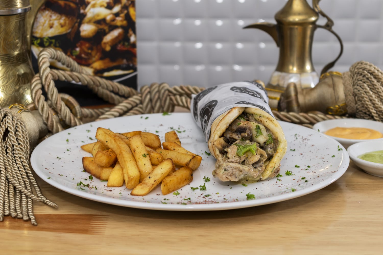 Carne y pollo shawarma, hummus, tabuleh, envuelto en pan árabe, acompañado de papas a la francesa.