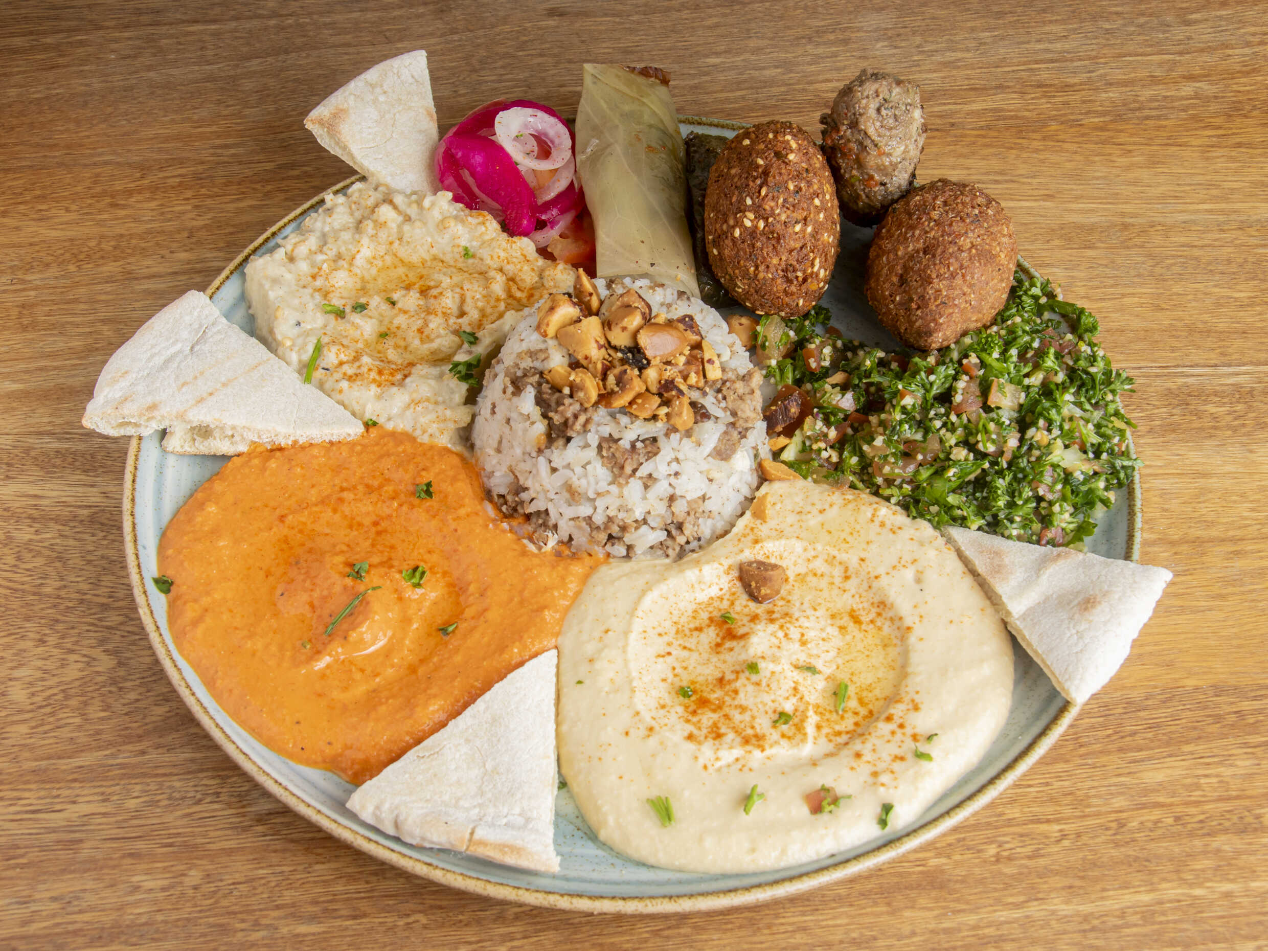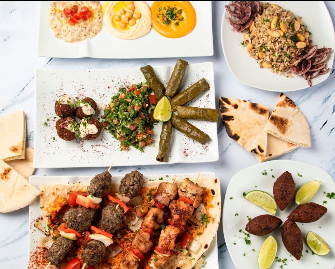Hummus, babaganush, tahine de pimentón, ensalada tabuleh, kafta, kibbe, falafel, arroz de almendras y pan árabe.
