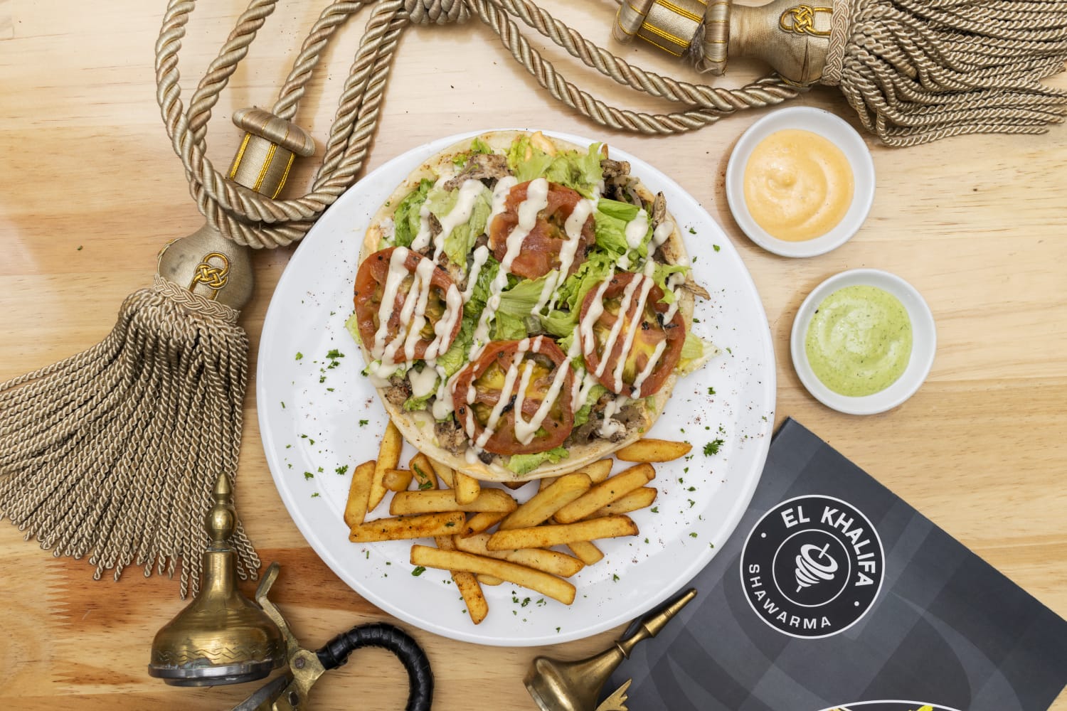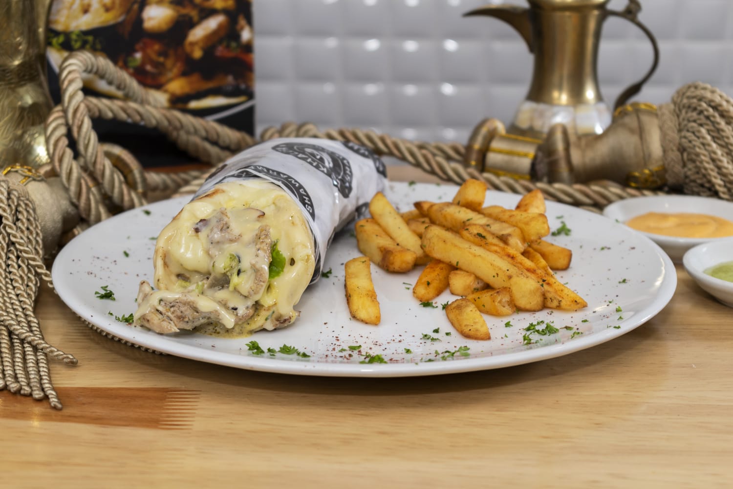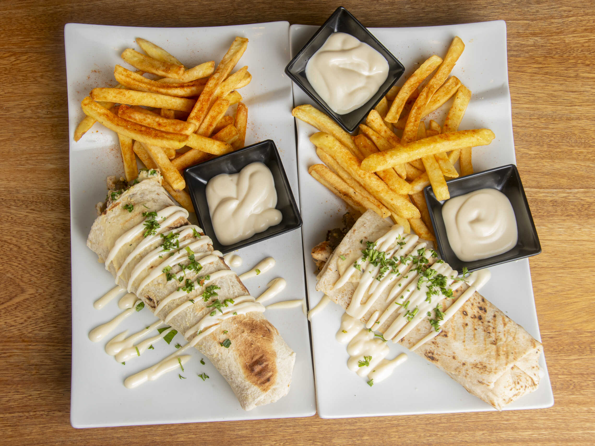 2 Shawarmas tradicionales de carne, pollo, lechuga, tomate, queso mozzarella, y salsa de ajo, acompañados de papas a la francesa.