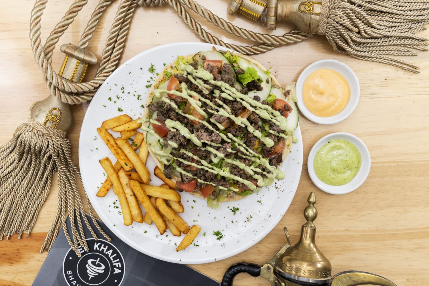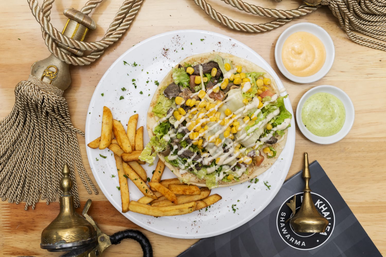 Pollo, res, cordero, lechuga, tomate, maíz tierno, queso mozzarella, salsa de ajo en una cama de pan árabe, acompañado de papas a la francesa.