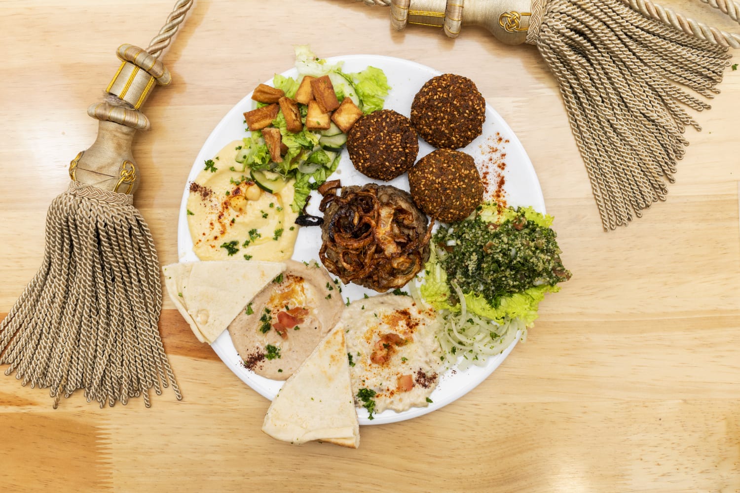Falafel, tahine de pimentón, tahine de berenjena, hummus, ensalada tabule, arroz de lentejas con aros de cebolla frita y pan árabe.