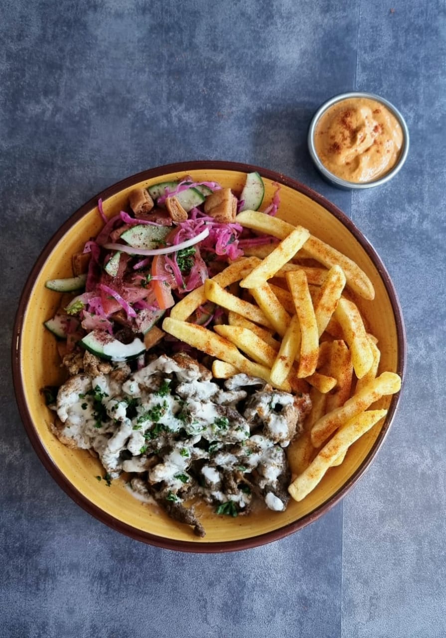 Shawarma a la plancha, papas a la francesa, ensalada árabe, salsa de pimentón