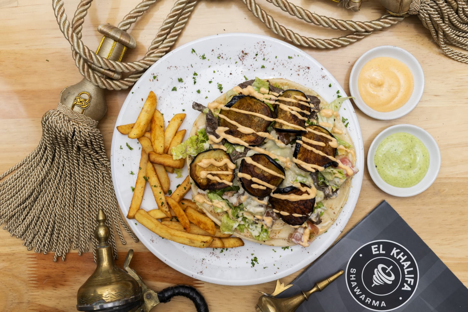 Pollo y carne shawarma, lechuga, tomate, berenjenas asadas, queso mozzarella, salsa de pimentón en una cama de pan árabe, acompañado de papas a la francesa.