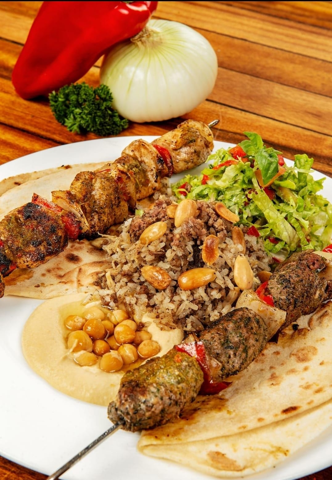 Pincho de pollo, pincho de res, arroz con almendras, tahine de garbanzo, ensalada tabuleh y pan árabe.