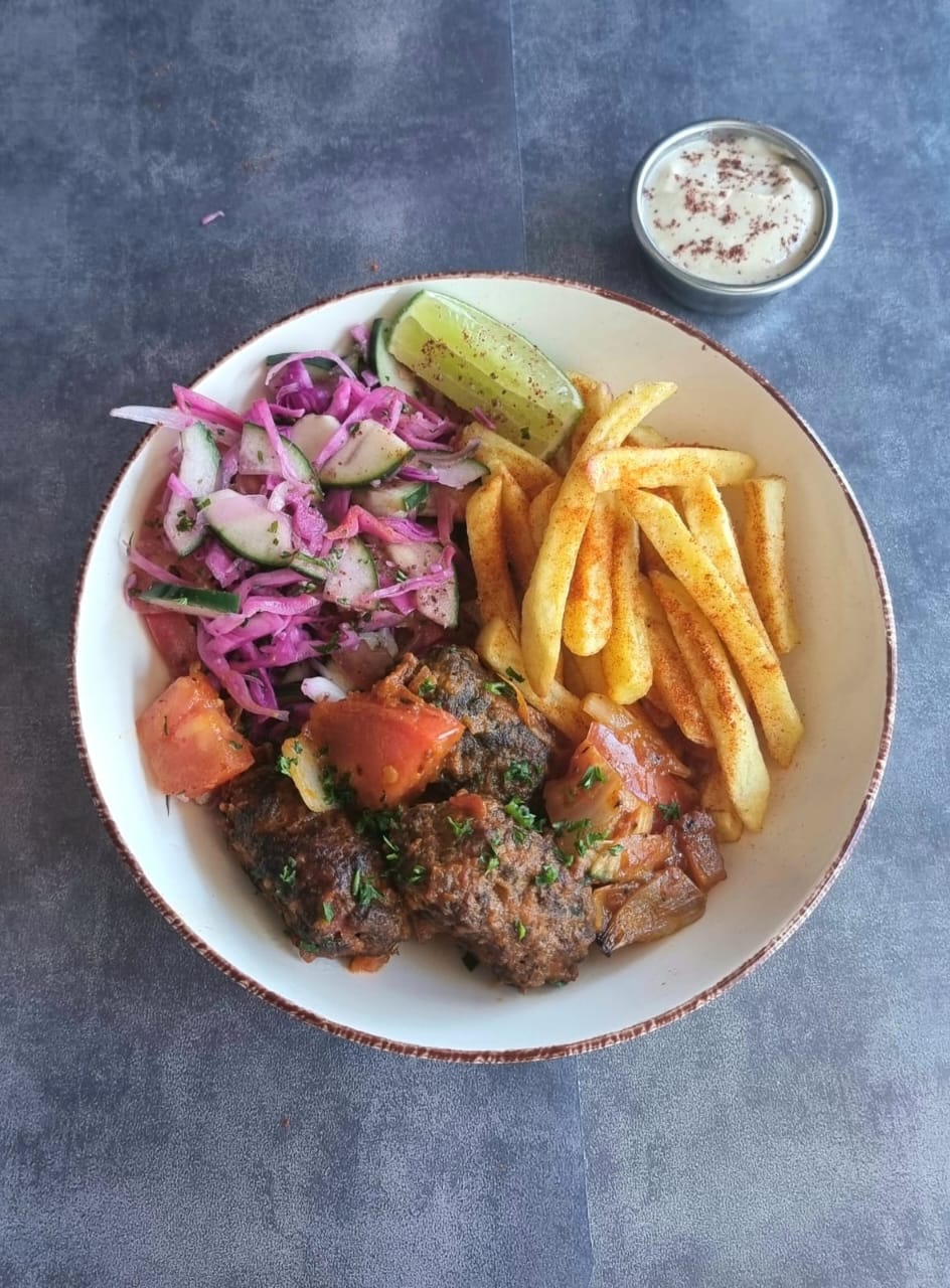 Ensalada árabe, papas a la francesa, kaftas a la parrila, limón