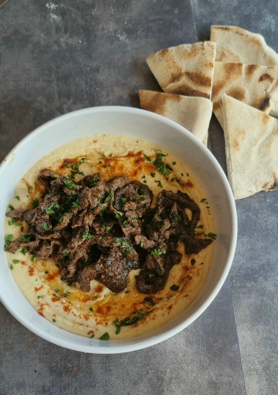 Hummus, tiras de carne a la plancha, especias árabes, pan árabe acompañado de 250 ml.