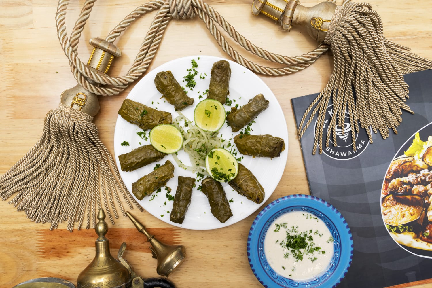 2 Pinchos de kafta, 2 pinchos de pollo, 4 kibbes, porción de tahine de garbanzo, porción de tabuleh, porción de arroz de almendras, porción de arroz de lentejas, 6 hojas de uva, 4 unidades de falafel, acompañado de pan árabe.