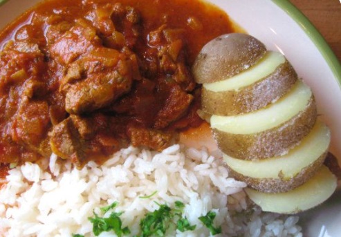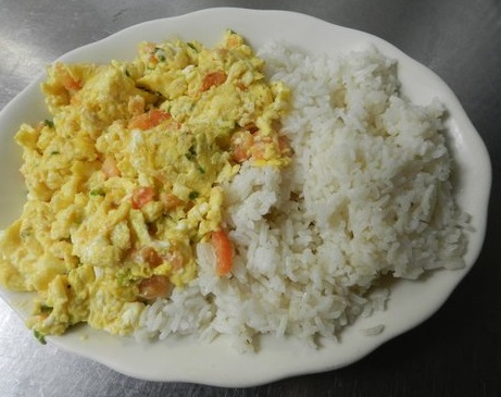 Arroz, huevos al gusto (huevos pericos, fritos, en tortilla o revueltos) tajada de plátano y carne.