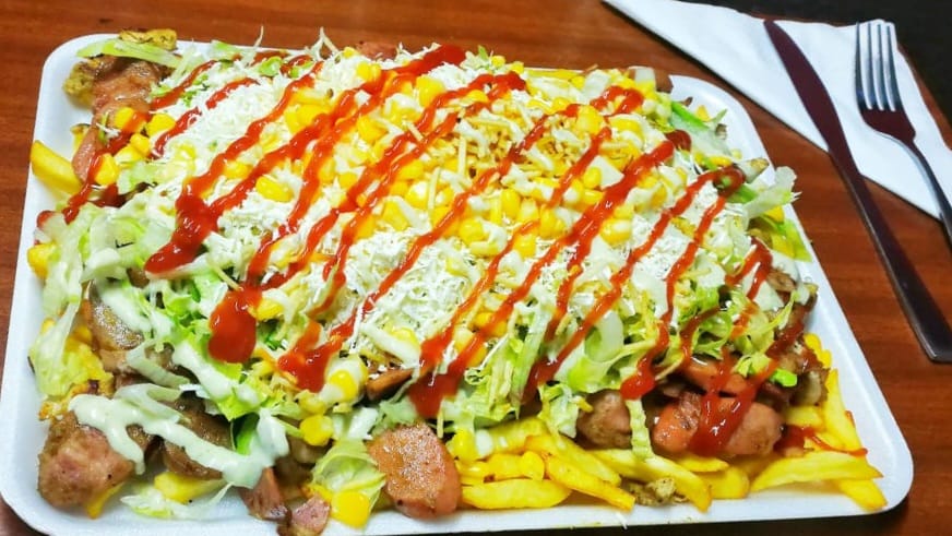Papas a la francesa con chorizo, pollo, carne , queso y lechuga.